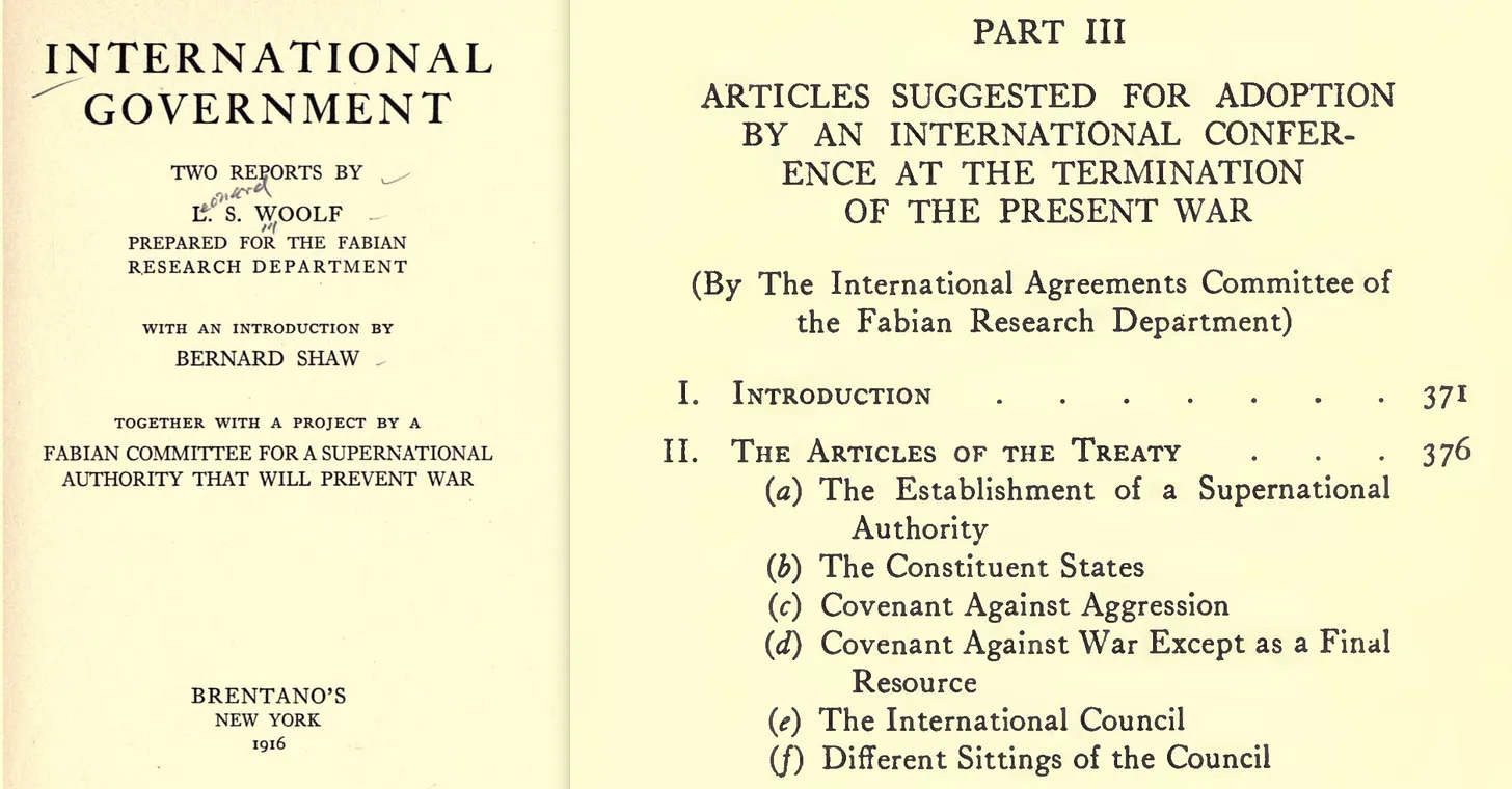 Ακούω τις αντιρρήσεις σας. Ας εντοπίσουμε λοιπόν το «International Government» [66] του Woolf από το 1916 για να διαπιστώσουμε τι ακριβώς προωθεί. Και δεν μπορεί πραγματικά να πλανάται αμφιβολία ότι αυτό σχετίζεται ρητά με την Εταιρεία Fabian.