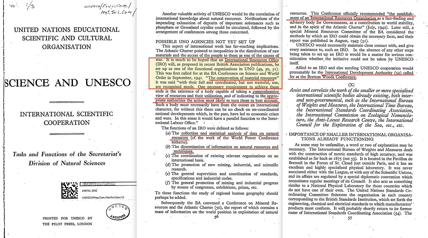 Εξαιρετικό. Απαντήθηκε το πρώτο ερώτημα. Στη συνέχεια, ας ρίξουμε μια ματιά στο έγγραφο του 1946 από την UNESCO με τίτλο «Επιστήμη και UNESCO: Διεθνής επιστημονική συνεργασία- καθήκοντα και λειτουργίες του τμήματος Φυσικών Επιστημών της Γραμματείας» [55] , μέσα από το οποίο βρίσκουμε γρήγορα εκκλήσεις για συγκέντρωση των πόρων στο όνομα της διατήρησης. Αυτό ευθυγραμμίζεται με αυτό που αργότερα θα γινόταν το World Resources Institute, το οποίο επηρεάστηκε σε μεγάλο βαθμό από το Ίδρυμα Rockefeller.