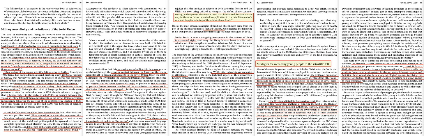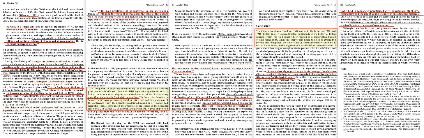 «... λίγη προσοχή έχει δοθεί στην τεράστια επιρροή που άσκησαν ο μαρξιστικός διεθνισμός και η νεαρή επιστημονική αριστερά στην ΕΣΣΔ στην ανερχόμενη γενιά των Βρετανών επιστημόνων... στα τέλη της δεκαετίας του 1930 και στις αρχές της δεκαετίας του 1940... η BAAS, της οποίας το σύνολο των δραστηριοτήτων κατά τα χρόνια του πολέμου είχε ουσιαστικά αναληφθεί από μια σημαίνουσα ομάδα νέων επιστημόνων και των οπαδών τους, αποφασισμένων να οδηγήσουν τη Βρετανία προς την κατεύθυνση του επιστημονικού σοσιαλισμού τύπου ΕΣΣΔ».