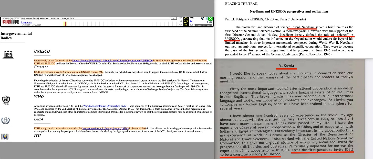 . Και τυχαίνει ότι η UNESCO όχι μόνο συνιδρύθηκε από τον Needham [49] , αλλά ο Needham επιπλέον «καθόρισε σε μεγάλο βαθμό το ρόλο της “επιστήμης” στην UNESCO». Έχω επισημάνει αυτό το θέμα και στο παρελθόν, επειδή σχεδόν αμέσως μετά την ίδρυσή της, η ICSU συγχωνεύτηκε με την UNESCO για να γίνει το «S» στην UNESCO [50]. Και ποιος κάλεσε το ICSU αρχικά; Η ίδια ακριβώς σοβιετική διεθνής προσωπικότητα, ο Viktor Kovda, ο οποίος θα είχε επίσης κατανοήσει τις συνέπειες του υπομνήματος Moynihan της 17ης Σεπτεμβρίου 1969.