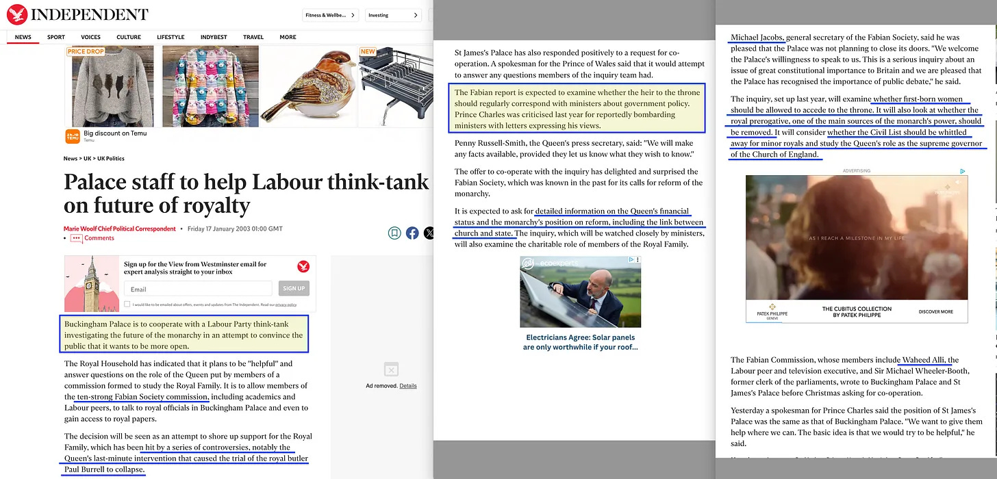 Αλλά παρόλο που η υπόθεση απορρίφθηκε, η ζημιά είχε γίνει και οι αγαπημένοι «ηθικοί σοσιαλιστές» επιτέθηκαν. Ανακοινώθηκε η διεξαγωγή έρευνας για τη Μοναρχία, και -από όλες τις οργανώσεις που θα μπορούσαν να την διευθύνουν- το έργο ανατέθηκε σε κανέναν άλλον εκτός από την Fabian Society, η οποία -σύμφωνα με άρθρο του BBC από το 2002- «ασκεί κάποια επιρροή στην κυβέρνηση των Εργατικών», κάτι που θα μπορούσε να θεωρηθεί η υποτίμηση του αιώνα. Υποσχέθηκαν να μην αφήσουν καμία πέτρα αναποδογυρισμένη - φτάνοντας μάλιστα στο σημείο να εξετάσουν το ενδεχόμενο κατάργησης της μοναρχίας [27].