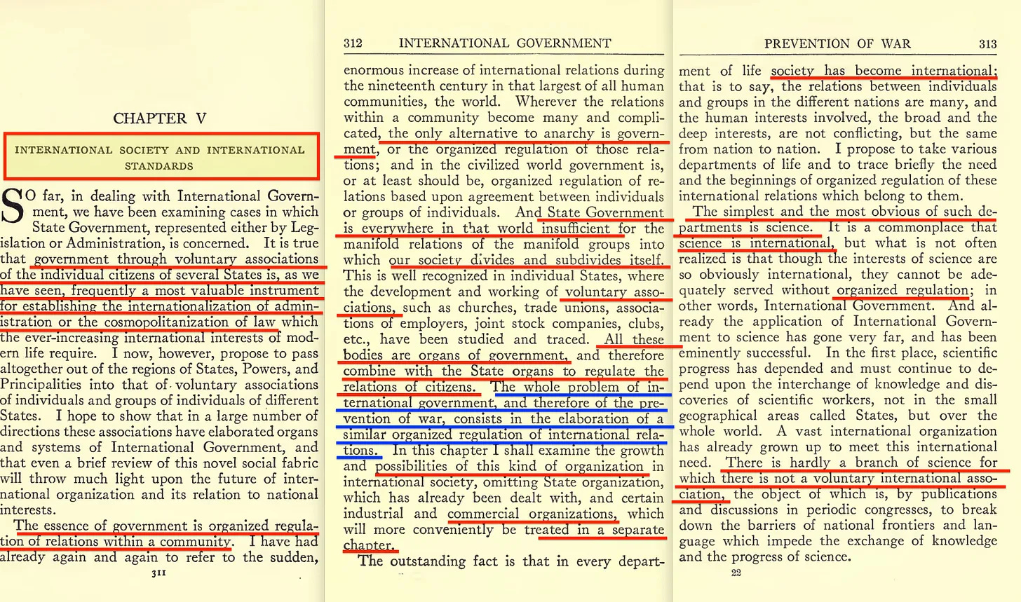 «Και η κρατική κυβέρνηση είναι παντού σε αυτόν τον κόσμο ανεπαρκής για τις πολυποίκιλες σχέσεις των πολυποίκιλων ομάδων στις οποίες διαιρείται και υποδιαιρείται η κοινωνία μας. Αυτό αναγνωρίζεται καλά σε μεμονωμένα κράτη, όπου έχει μελετηθεί και ανιχνευθεί η ανάπτυξη και η λειτουργία εθελοντικών ενώσεων, όπως οι εκκλησίες, τα συνδικάτα, οι ενώσεις εργοδοτών, οι ανώνυμες εταιρείες, οι σύλλογοι κ.λπ. Όλοι αυτοί οι οργανισμοί είναι όργανα της κυβέρνησης και, επομένως, συνδυάζονται με τα κρατικά όργανα για να ρυθμίσουν τις σχέσεις των πολιτών».