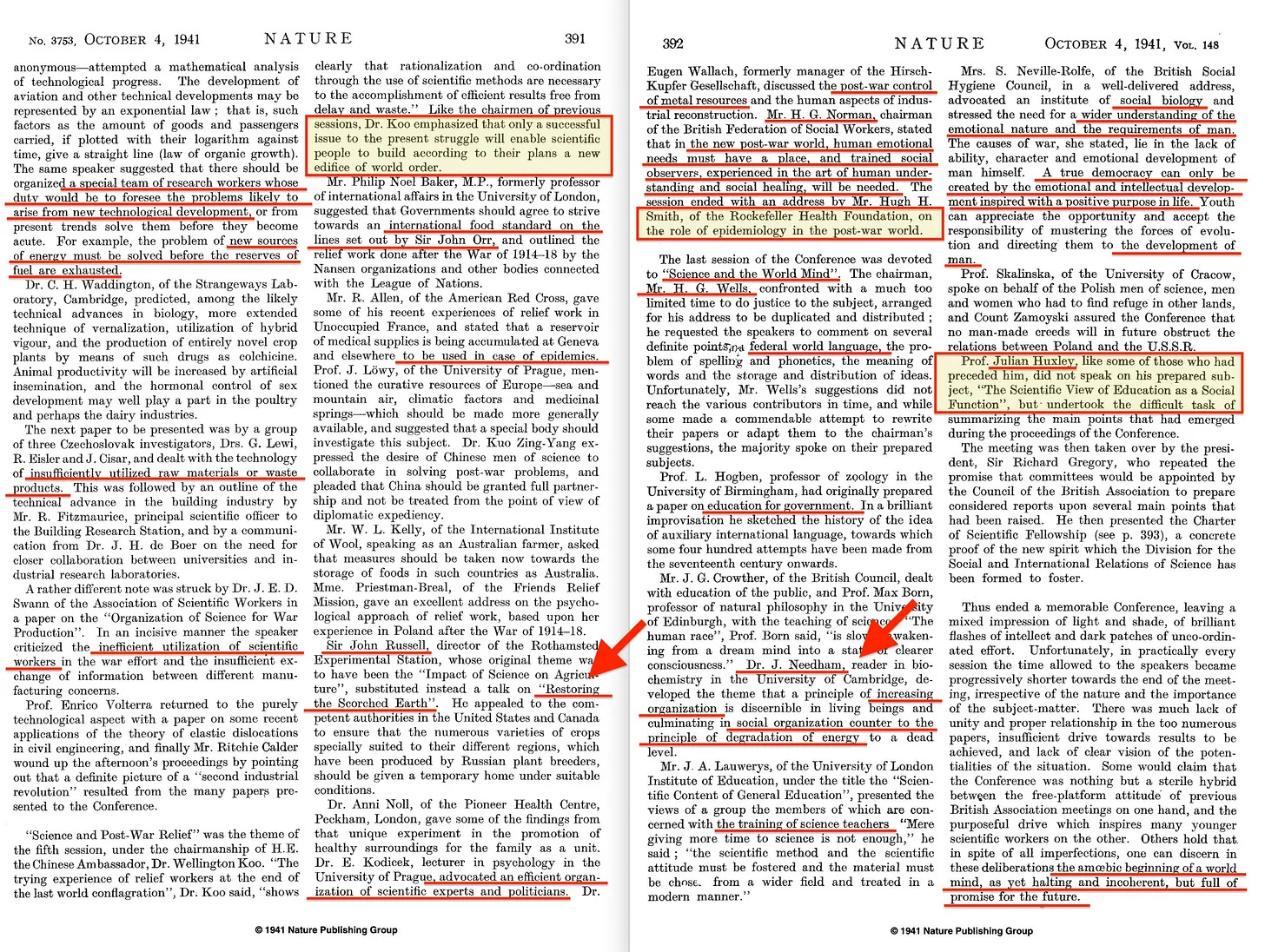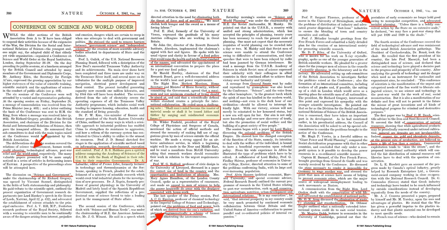 . Αν χρειάζεστε περισσότερες λεπτομέρειες για το συνέδριο αυτό του 1941, μπορείτε να τις βρείτε εδώ [52]. Παρεμπιπτόντως, συμμετείχαν μεταξύ άλλων ο Julian Huxley (UNESCO, IUCN, IHEU [53]), ο Joseph Needham (UNESCO, WAAS54), ο John Boyd Orr (UNFAO, WAAS), ο HG Wells (Fabian Society) και το Ίδρυμα Rockefeller. Και το βασικό θέμα της ημέρας αφορούσε τον προγραμματισμό. Και παρόλο που θα μπορούσα να παραθέσω εκτενώς αυτό το... φεστιβάλ της κολεκτιβιστικής ιδεολογίας ας το κάνω μόνο μία φορά -