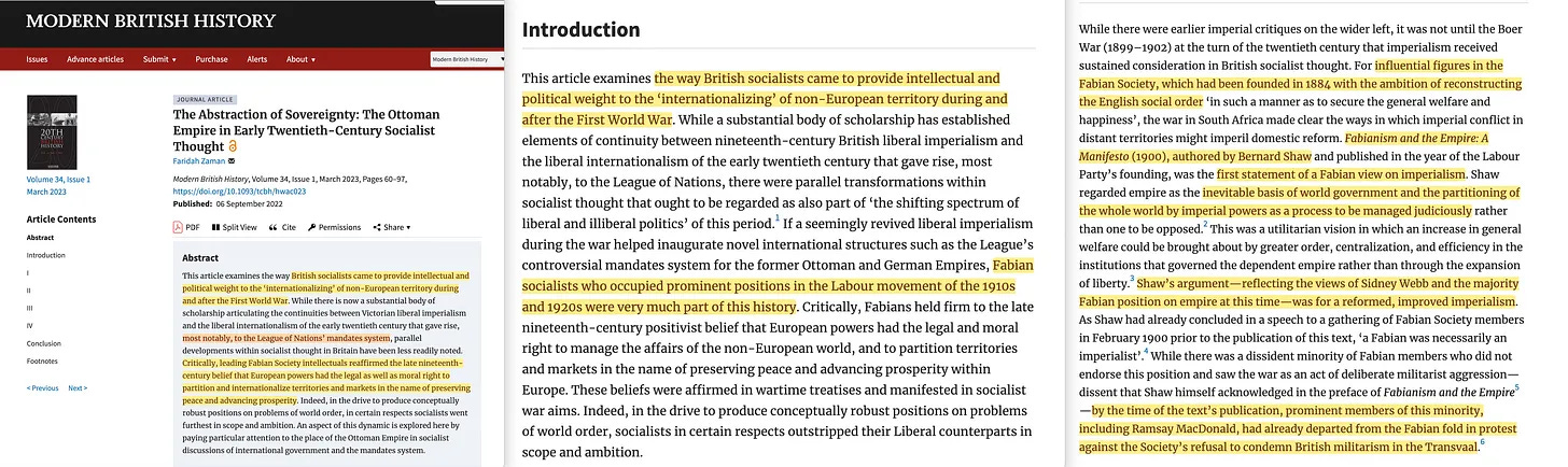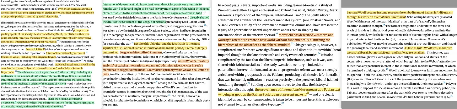 Ο Alfred Zimmern και η Κοινωνία των Εθνών είναι ενδιαφέροντα θέματα. Και σε αυτό το πλαίσιο, το άρθρο 2022 «The Abstraction of Sovereignty: The Ottoman Empire in Early Twentieth-Century Socialist Thought» («Η Αφαίρεση της Κυριαρχίας: Η Οθωμανική Αυτοκρατορία στην σοσιαλιστική σκέψη των αρχών του 20ού αιώνα») [60] λάμπει περισσότερο από έναν λαμπρό πυρσό στην απάντηση του επόμενου ερωτήματος. Και αυτό -για άλλη μια φορά- παρασύρει στο ρόλο της Fabian Society.