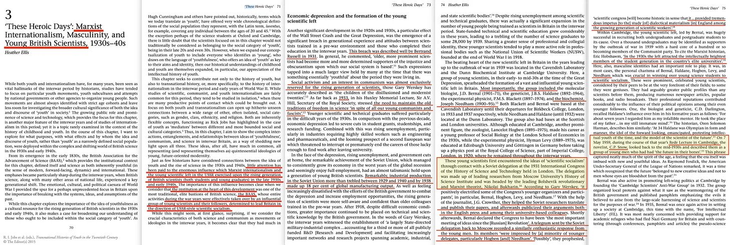 Το 2015 κυκλοφόρησε το βιβλίο «Transnational Histories of Youth in the Twentieth Century», και μέσα από το κεφάλαιο με τίτλο «These Heroic Days»: Marxist Internationalism, Masculinity, and Young British Scientists, 1930s-40s» [48] παρέχει το πρώτο στοιχείο. Και αυτό το κεφάλαιο πραγματικά ανοίγει τα μάτια -