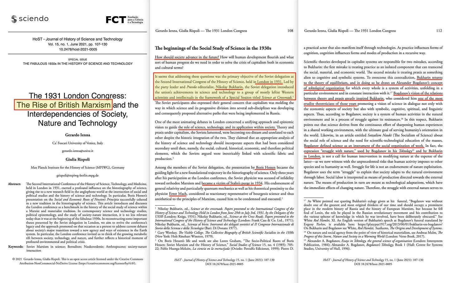 «Αυτοί οι νέοι επιστήμονες συνάντησαν για πρώτη φορά τις ιδέες του »επιστημονικού σοσιαλισμού” μέσω της επαφής τους με μια σοβιετική αντιπροσωπεία στο Διεθνές Συνέδριο Ιστορίας της Επιστήμης και της Τεχνολογίας που πραγματοποιήθηκε το 1931 στο Λονδίνο. Η αντιπροσωπεία αποτελούνταν από κορυφαίους ερευνητές του Ινστιτούτου Ιστορίας της Επιστήμης του Πανεπιστημίου της Μόσχας και είχε επικεφαλής τον κορυφαίο μπολσεβίκο επαναστάτη και θεωρητικό του μαρξισμού, Nikolai Bukharin»