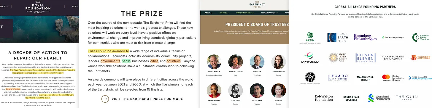 Όσον αφορά τον διάδοχό του, τον πρίγκιπα William, φαίνεται ότι ακολουθεί τα βήματα του [8] πατέρα του [9,10] , με την πρώην πρωθυπουργό της Νέας Ζηλανδίας, Jacinda Ardern, να συμμετέχει στο εγχείρημά του «Earthshot Prize», το οποίο - κατά παράδοση - χρηματοδοτείται από όλους τους «φιλάνθρωπους».