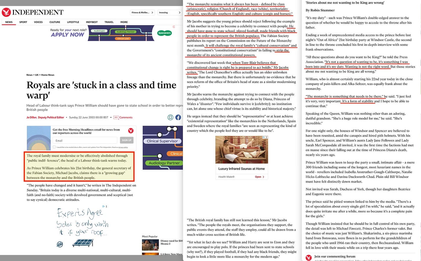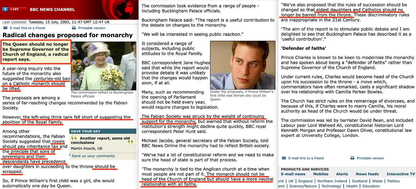 Ο Michael Jacobs, διευθυντής της Fabian Society και συγγραφέας του βιβλίου In Tandem (που συνδέεται παραπάνω), έφτασε στο σημείο να προτείνει ότι «ο πρίγκιπας William θα έπρεπε να πάει σε κρατικό σχολείο» και ότι όλες οι συνταγματικές εξουσίες της βασιλικής οικογένειας θα έπρεπε να καταργηθούν, σηματοδοτώντας μια ώθηση για πιο ριζική μεταρρύθμιση του ρόλου της μοναρχίας στη διακυβέρνηση του Ηνωμένου Βασιλείου [34].