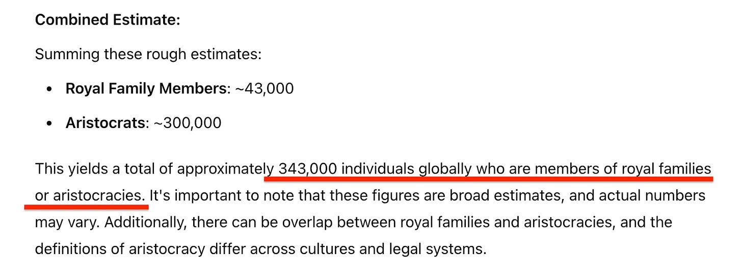 Αλλά αυτό παρουσιάζει ένα ζήτημα. Πόσες μοναρχίες υπάρχουν σήμερα στον κόσμο; Και πόσα μέλη της οικογένειας περιλαμβάνουν αυτές; Και αν λάβουμε υπόψη και τις συναφείς αριστοκρατίες... σε πόσα άτομα ανέρχονται συνολικά;