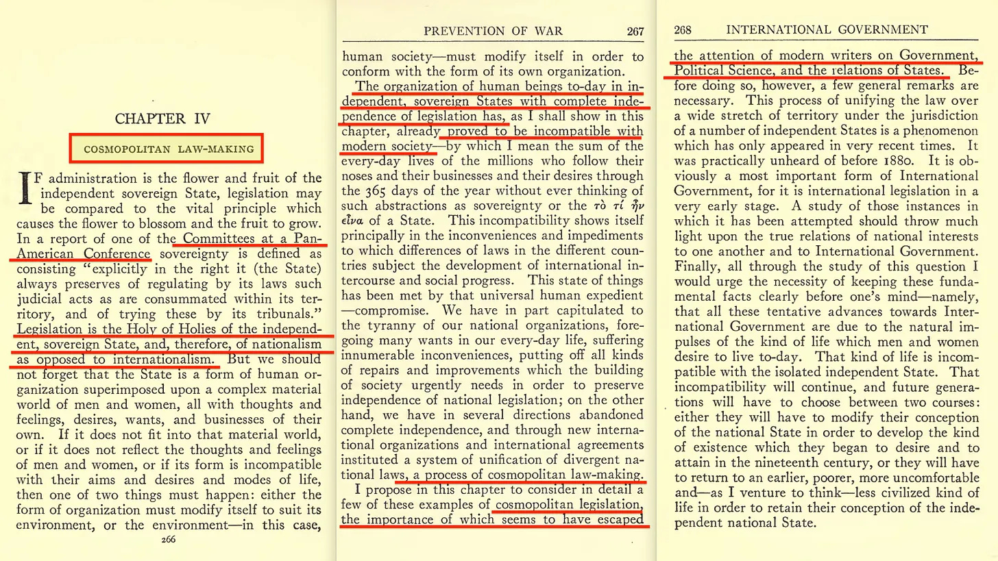 «Ολόκληρο το πρόβλημα της διεθνούς διακυβέρνησης, και επομένως της πρόληψης του πολέμου, συνίσταται στην επεξεργασία μιας παρόμοιας οργανωμένης ρύθμισης των διεθνών σχέσεων».