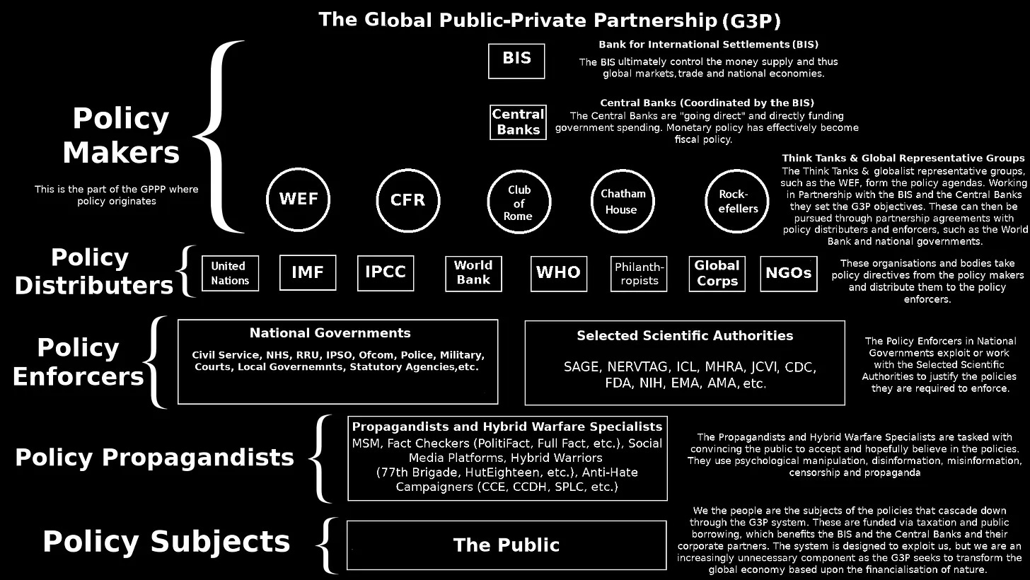 Η Παγκόσμια Σύμπραξη Δημόσιου-Ιδιωτικού Τομέα (G3P - Σημ.: Τα περιβόητα ΣΔΙΤ) —ουσιαστικά ένας σύνδεσμος μεταξύ κεντρικών τραπεζών, διεθνών think tanks πολιτικής, του ΟΗΕ, πολυεθνικών εταιρειών, ΜΚΟ και άλλων «φιλανθρωπικών» οργανώσεων, καθώς και κυβερνήσεων— προωθεί την παγκόσμια εφαρμογή της ψηφιακής ταυτότητας. Στους «εταίρους» της ID4D περιλαμβάνονται το Ίδρυμα Γκέιτς, το Omidyar Network και το Παγκόσμιο Οικονομικό Φόρουμ (WEF), το οποίο εκπροσωπεί «κορυφαίες παγκόσμιες εταιρείες» που επιδιώκουν να «διαμορφώσουν το μέλλον».