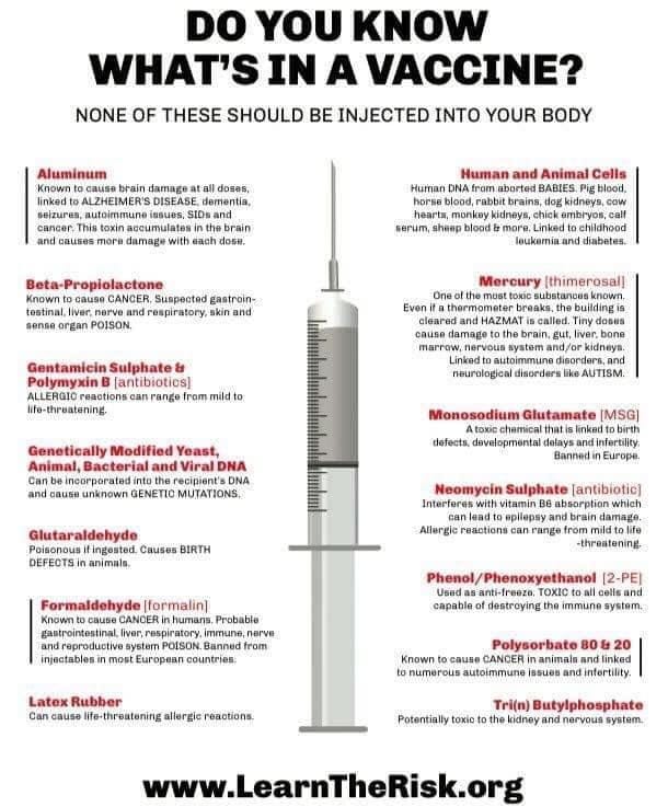 Τα εμβόλια μπορεί να περιέχουν αλουμίνιο, υδράργυρο, φορμαλδεΰδη, αντιβιοτικά, ανθρώπινα εμβρυϊκά κύτταρα, ΓΤΟ (Γενετικά Τροποποιημένους Οργανισμούς), ζωικές πρωτεΐνες και DNA, γλυφοσάτη και άλλες ουσίες που είναι δυνητικά επικίνδυνες όταν ενίονται.