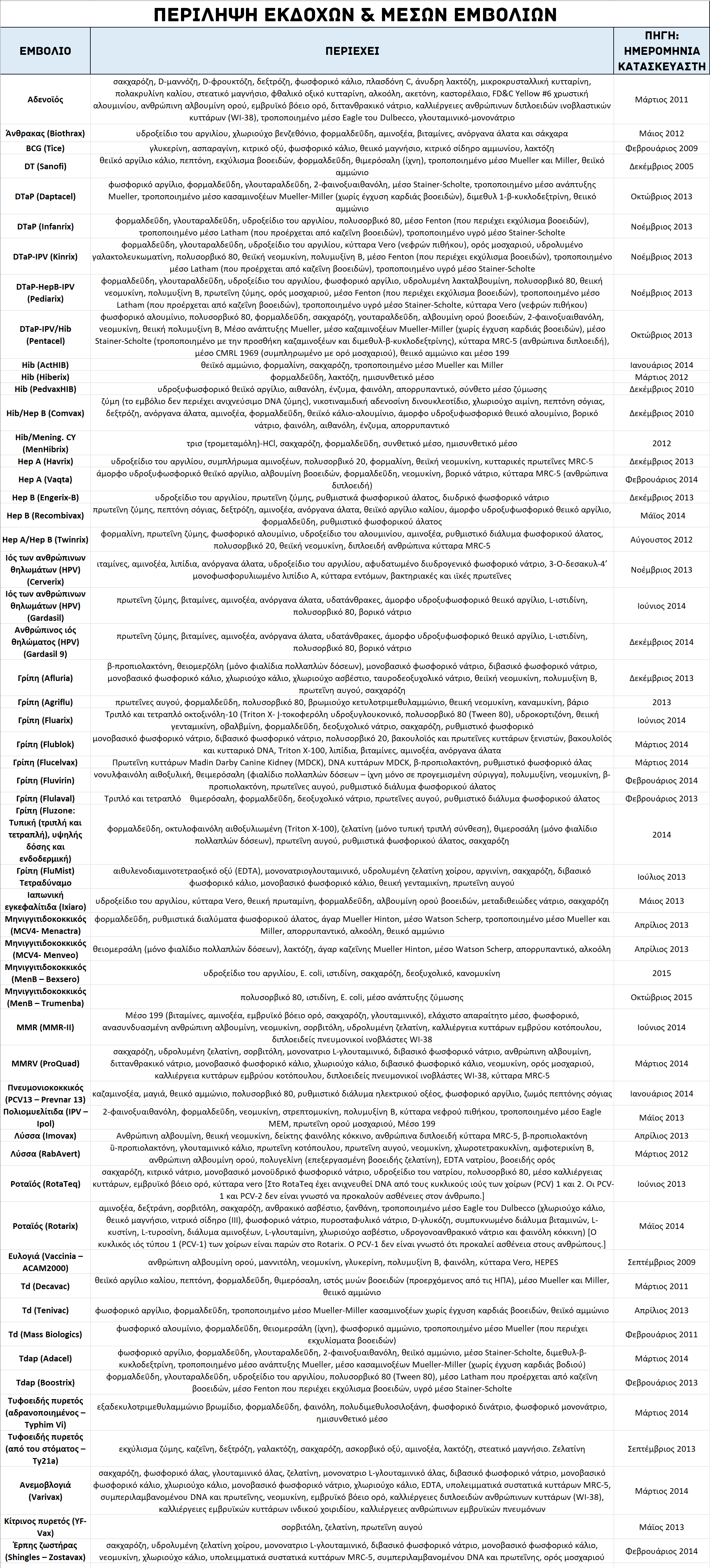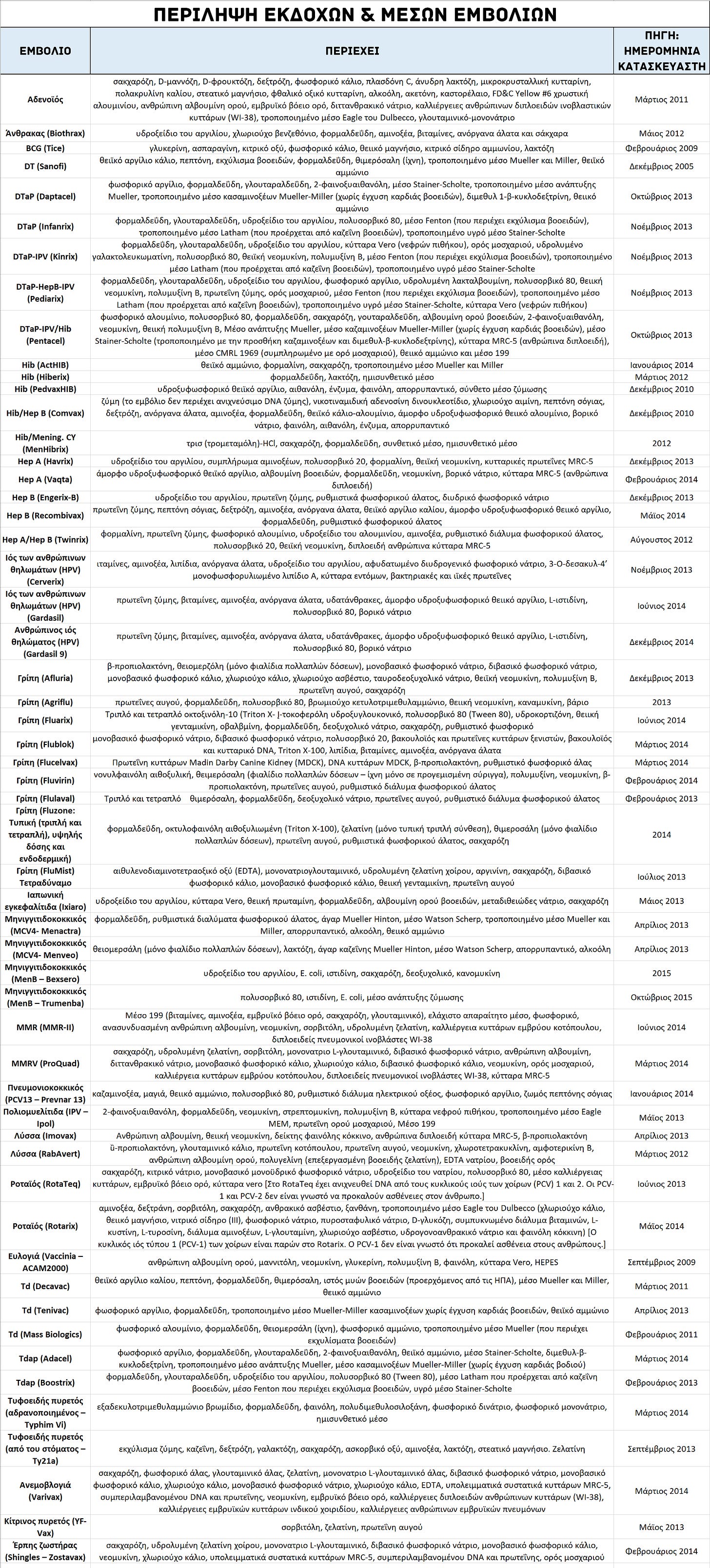 Ένας πίνακας με τα έκδοχα εμβολίων και τα μέσα ανά έκδοχο βρίσκεται στο: Grabenstein JD. ImmunoFacts: Vaccines and Immunologic Drugs – 2013
