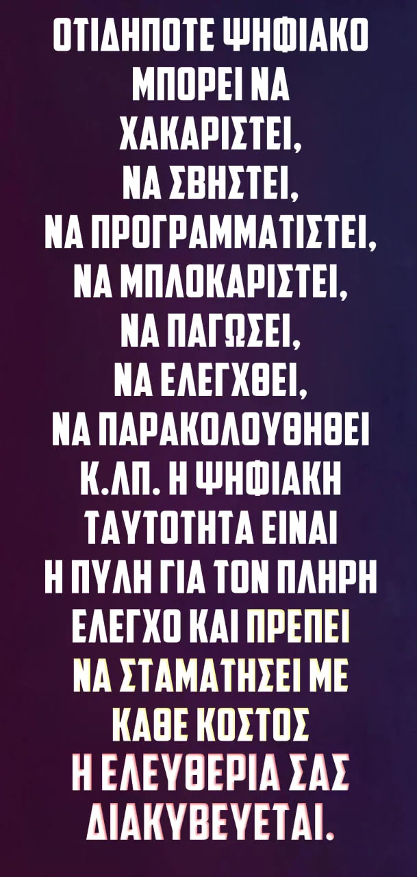 Πώς προσπαθεί η χώρα σας να δικαιολογήσει την ψηφιακή ταυτότητα; Τι λένε ότι θα χρησιμοποιηθεί; Υπάρχει τρόπος να ξεφύγουμε από αυτό ή θα μας το επιβάλλουν μέχρι να ενδώσουμε; Τι σκοπεύετε να κάνετε γι’ αυτό; Μοιραστείτε τις σκέψεις σας παρακάτω.