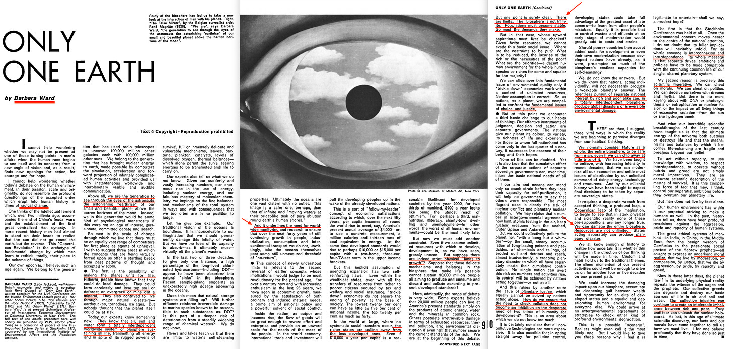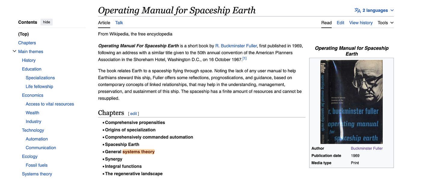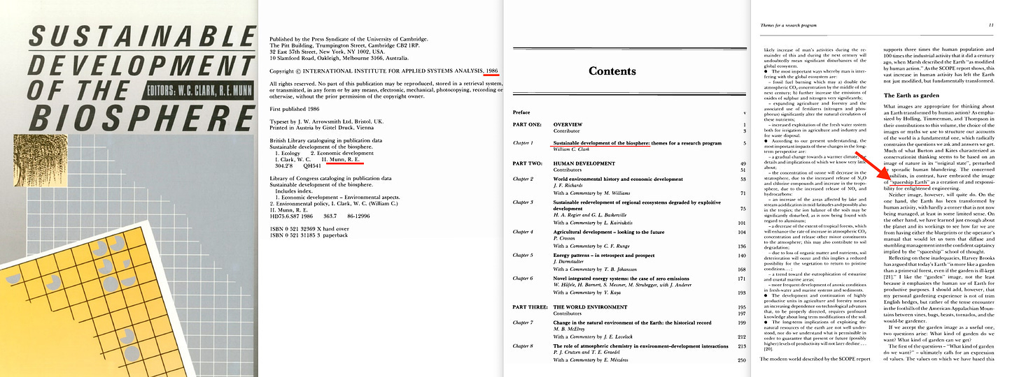 Όπως ειπώθηκε, η έννοια του Spaceship Earth είναι η «συστημική θεωρία», ένας όρος που χρησιμοποιείται επίσης κατά την περιγραφή της Κυκλικής Οικονομίας [28] και της Βιώσιμης Ανάπτυξης [29]. Και χωρίς να την κατονομάζουμε ρητά, ήταν αυτή που περιέγραψε η Barbara Ward σε δύο βιβλία, πρώτα το «Spaceship Earth» και στη συνέχεια το «Only One Earth» [30] που εξέδωσε ο Maurice Strong κατά την εναρκτήρια συνάντηση του ΟΗΕ για το περιβάλλον στη Στοκχόλμη το 1972.