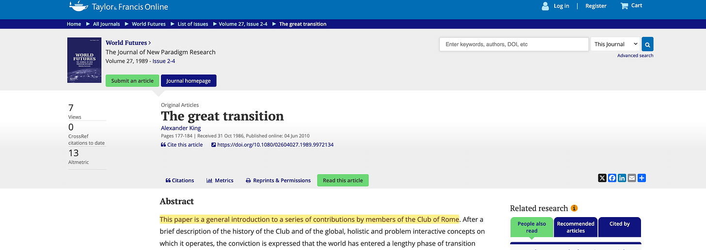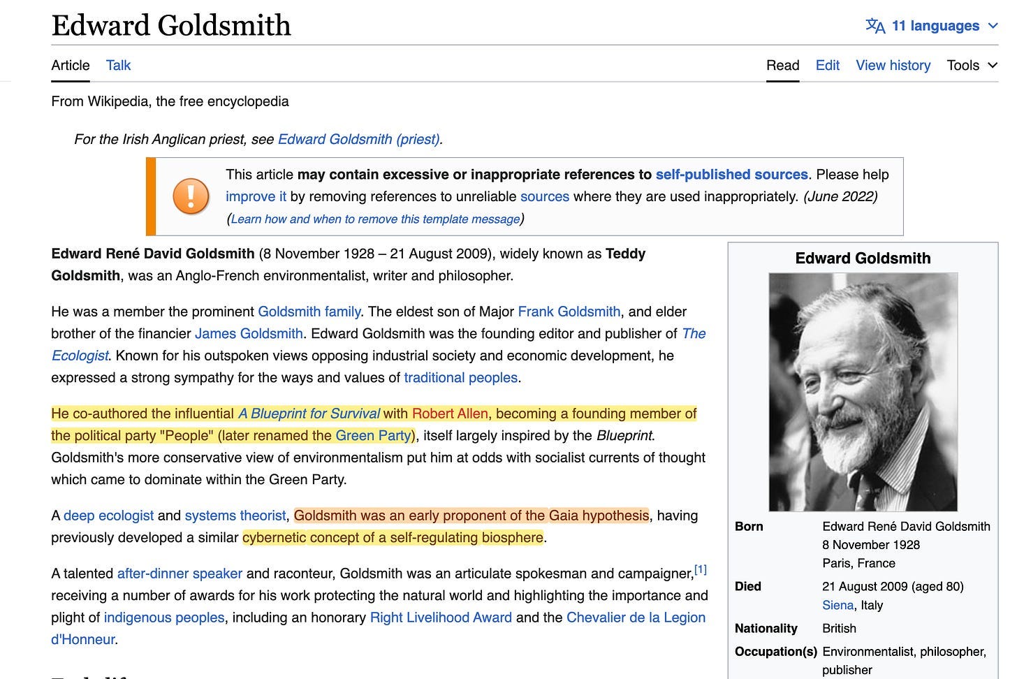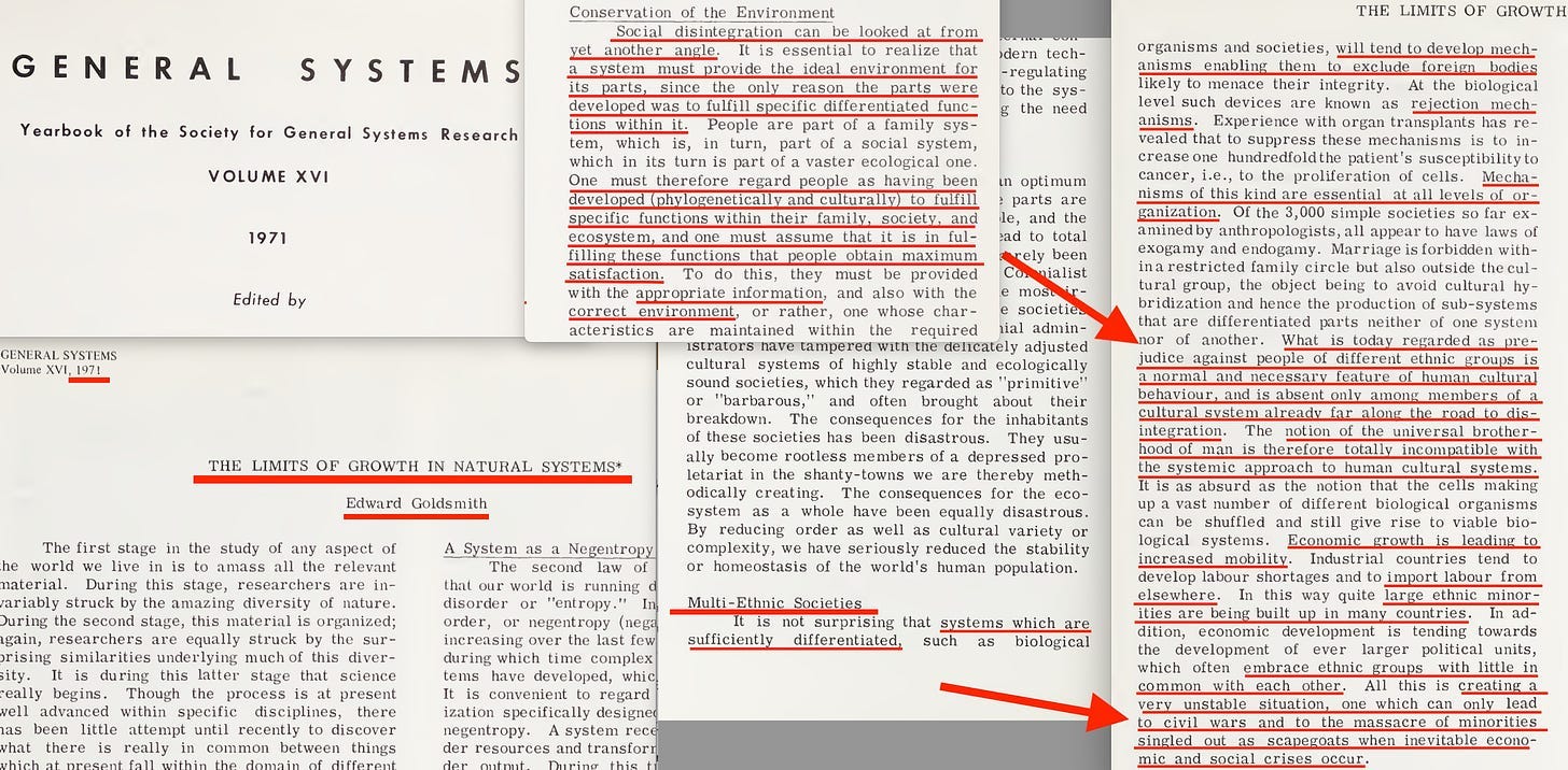 Ένας τέτοιος ψυχοπαθής ήταν ο Edward Goldsmith [6], γνωστός συνιδρυτής του βρετανικού «Πράσινου» Κόμματος, ο οποίος στην ετήσια έκθεση της εταιρείας το 1971 περιέγραψε στο έπος του: 'The Limits of Growth in Natural Systems' («Τα όρια της ανάπτυξης στα φυσικά συστήματα») [7] ότι μια ελεύθερη κοινωνία αποτελεί μια κοινωνία που βρίσκεται στο δρόμο της αυτοκαταστροφής και, επομένως, όσο πιο άκαμπτη είναι η κοινωνική δομή, τόσο το καλύτερο. Παρεμπιπτόντως, αυτή η δομή θα πρέπει να επιτηρείται και τα «κύτταρα» να ελέγχονται σε περίπτωση που αποτελέσουν πρόβλημα. Επιπλέον, περιέγραψε πώς η μετανάστευση οδηγεί σε σφαγές μειονοτικών ομάδων, σε προφανή σύγκρουση με τη γενική ιδεολογία του πολιτικού κόμματος που ίδρυσε. Τελείωσε δηλώνοντας ότι οι οικογένειες που αντιμετωπίζουν προβλήματα πρέπει να χειραγωγούνται προς τη διάλυση, καθώς αυτό είναι προς το συμφέρον του ευρύτερου συστήματος [8].