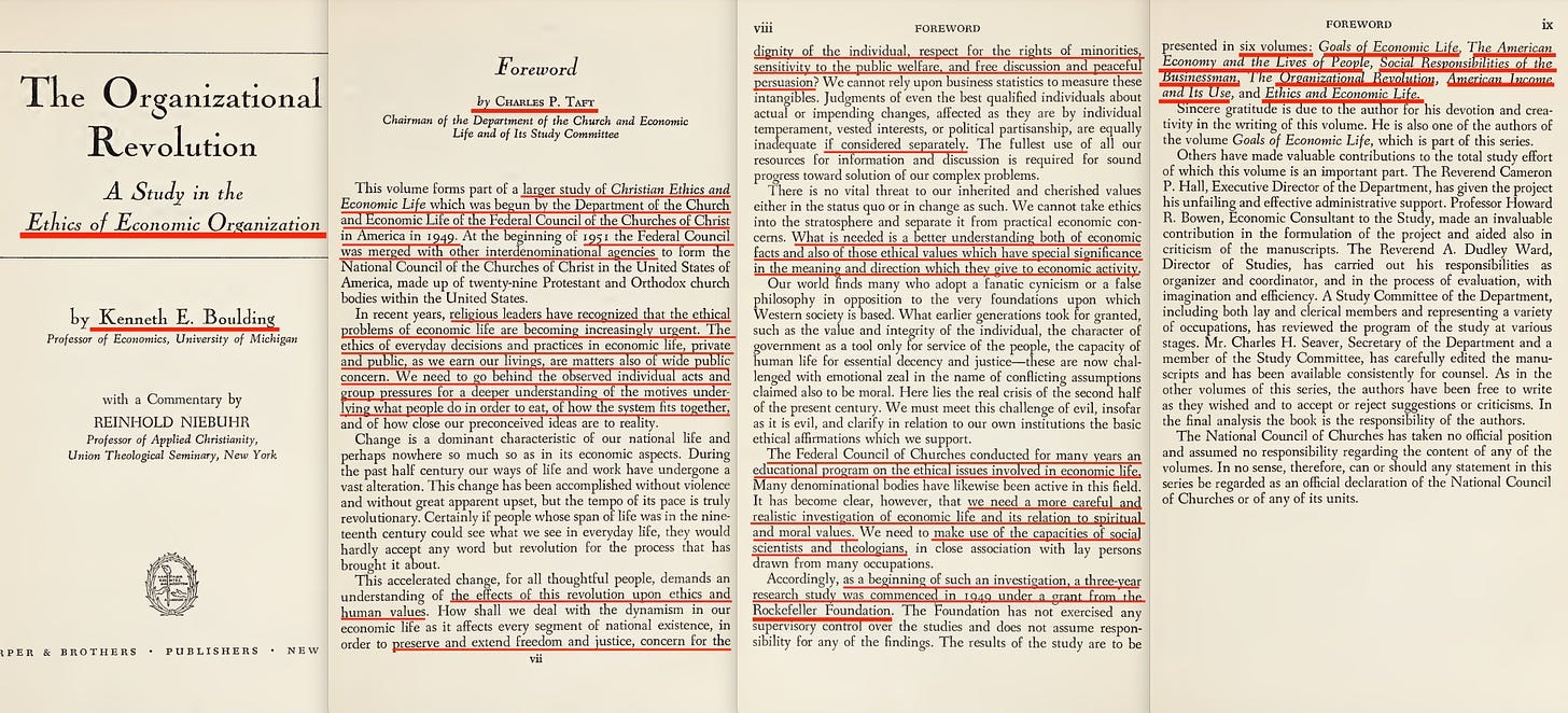Το 1953, ο Kenneth Boulding έγραψε ένα βιβλίο [1], περιγράφοντας την πρώιμη διαφθορά των κεντρικών εκκλησιαστικών οργανώσεων της Αμερικής, μέσω αυθαίρετων ορισμών της «ηθικής» που περιγράφηκαν από κοινωνικό επιστήμονα σε μια μελέτη που διεξήχθη μέσω... Χρηματοδότησης από τον Rockefeller.