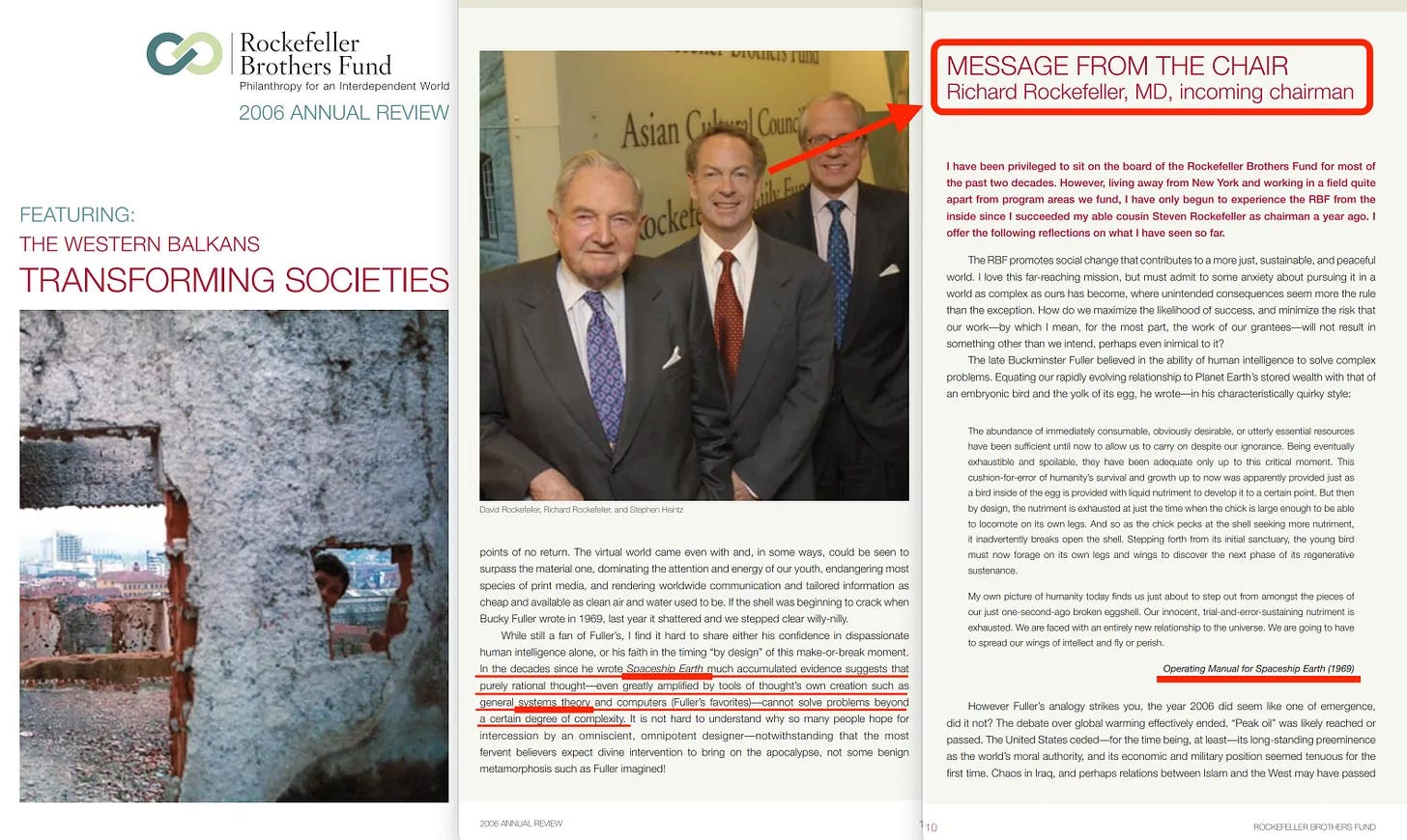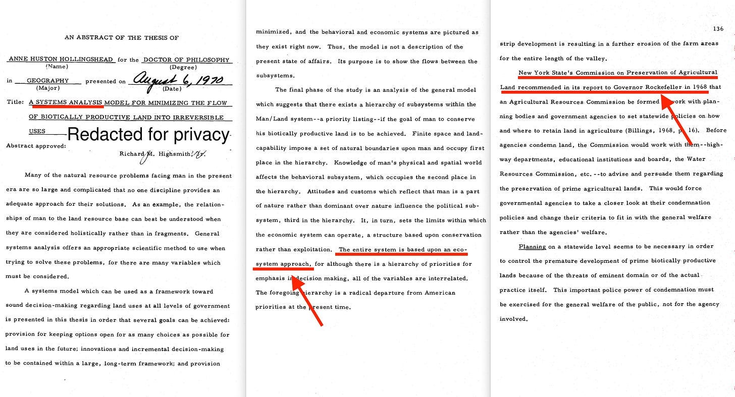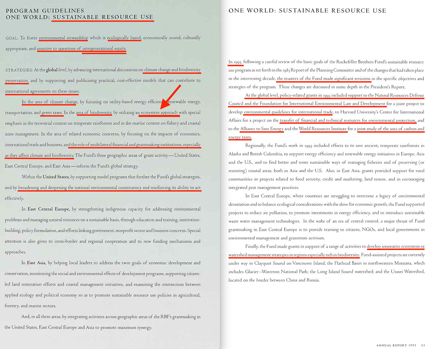 Στα τέλη της δεκαετίας του 1960, η Πολιτεία της Νέας Υόρκης άρχισε να διαμορφώνει νέους νόμους για τη χρήση γης/ανθρώπων, όπου τα ατομικά δικαιώματα απογυμνώνονται προς όφελος του σχεδιασμού από πάνω προς τα κάτω. Αυτό πέρασε μέσα από τη θεωρία των συστημάτων [25] και έγινε η «Οικοσυστημική Προσέγγιση», η οποία σταδιακά εξελίχθηκε μέχρι που είδαμε τον πλήρη ορισμό να φτάνει επί Clinton/Gore [26], σε μια ακόμη πρωτοβουλία που επηρεάστηκε σε μεγάλο βαθμό από... Rockefeller [27]. Παρεμπιπτόντως, ο κυβερνήτης της πολιτείας της Νέας Υόρκης εκείνη την εποχή ήταν... Nelson Rockefeller.