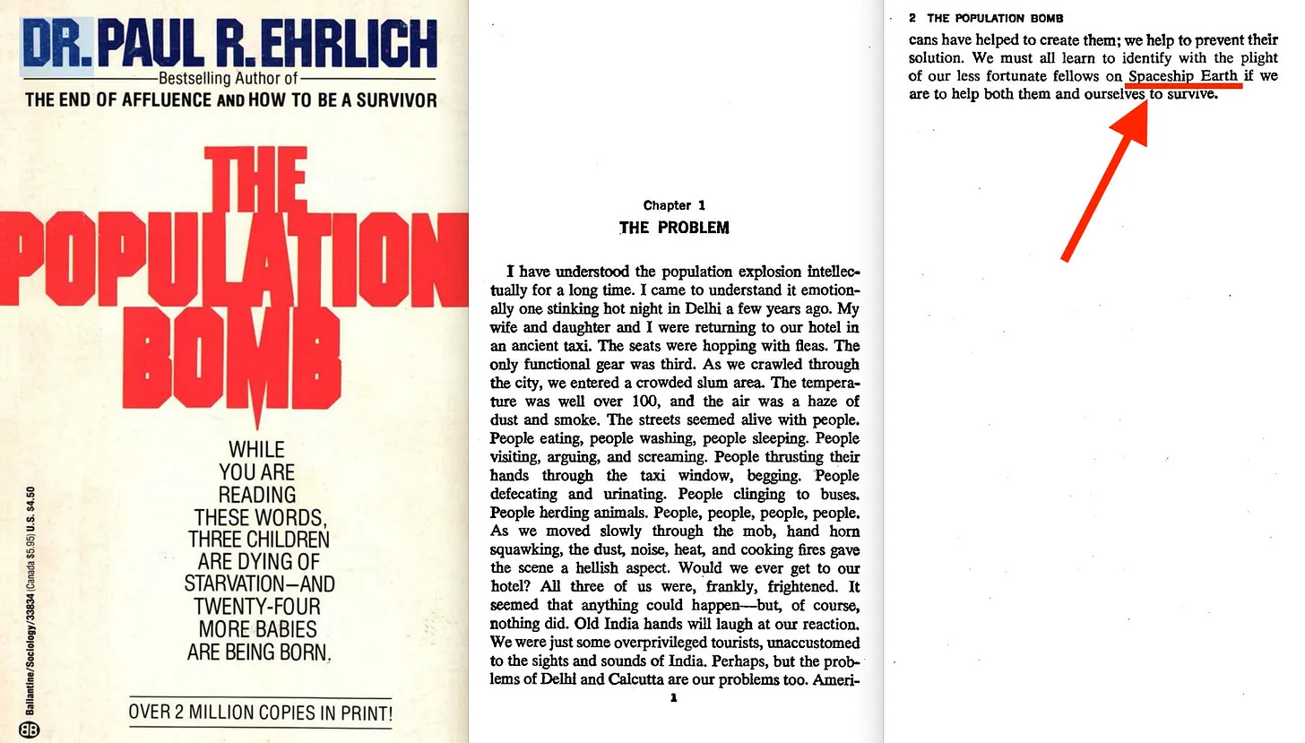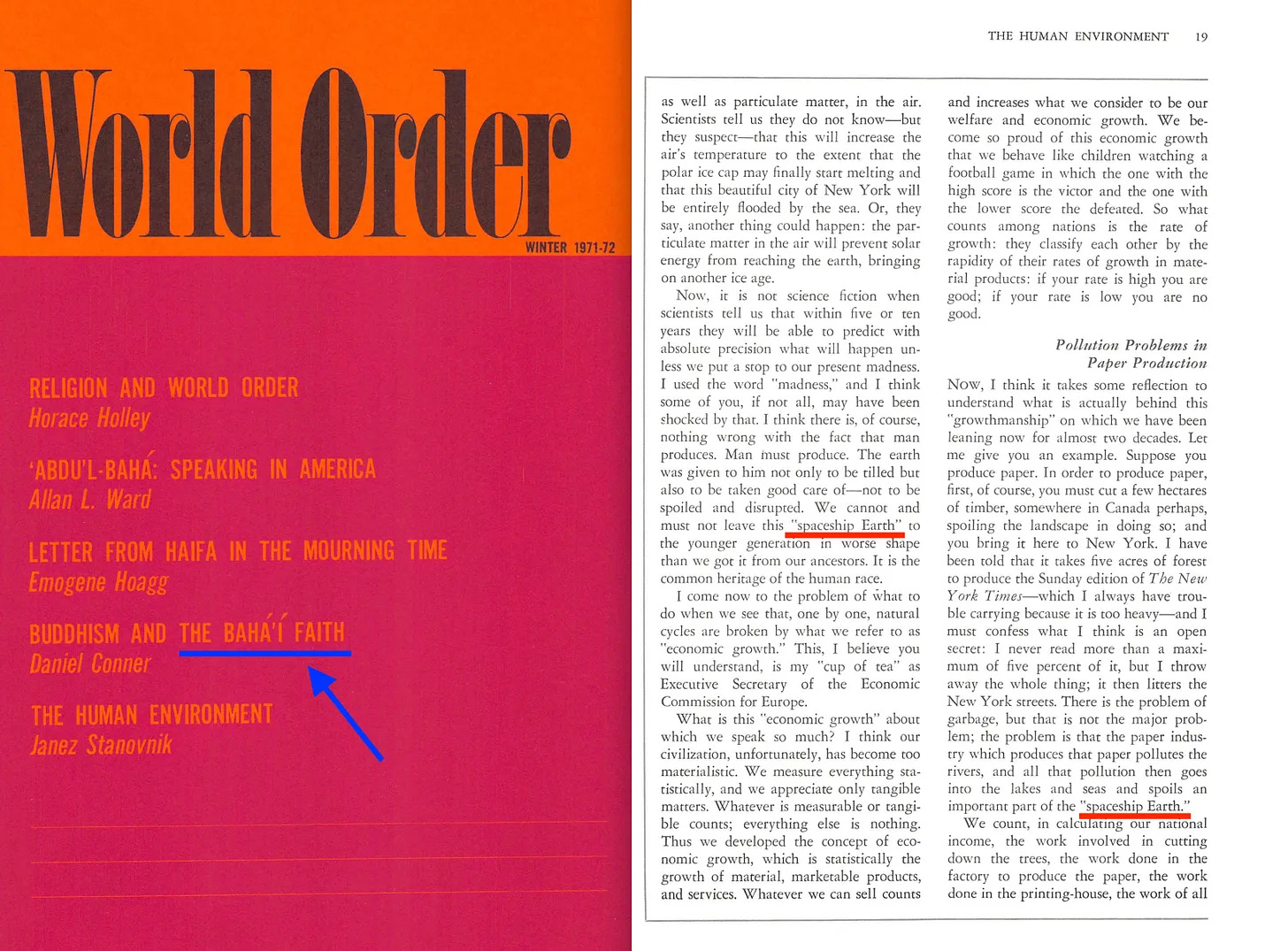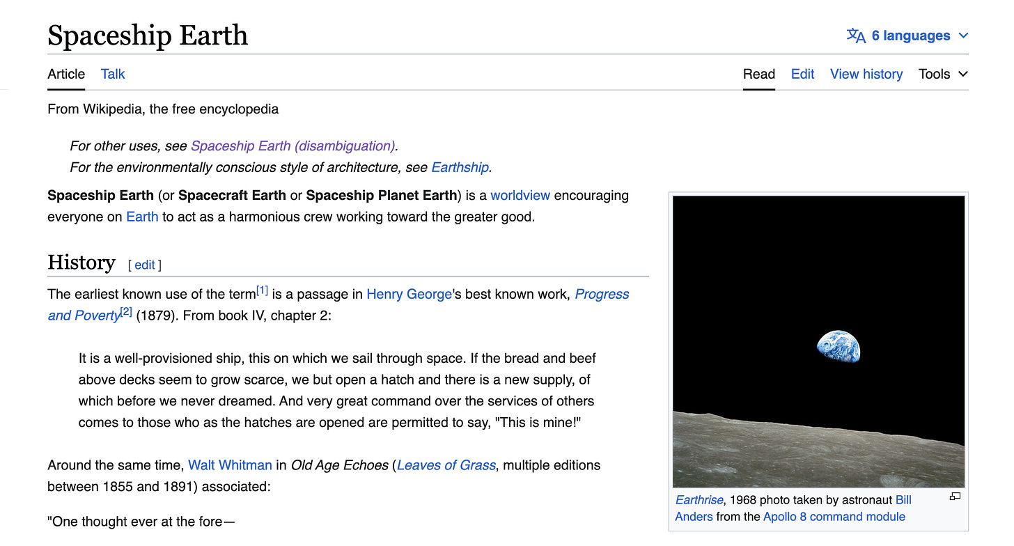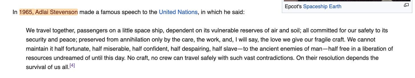 Η θεωρία του «Διαστημόπλοιου Γη» ( Spaceship Earth) [20] ξεκίνησε το 1965, όταν ο Adlai Stevenson [21] στην τελευταία του εμφάνιση στα Ηνωμένα Έθνη συμπεριέλαβε τον όρο σε μια ομιλία του στη Γενεύη. Το 1966 ακολούθησε το βιβλίο της Barbara Ward [22] με παρόμοιο τίτλο και η εργασία του Kenneth Boulding, «The Economics of the Coming Spaceship Earth» [23]. Τέλος, ο Buckminster Fuller θα εκλαΐκευε περαιτέρω τον όρο αυτό, μέσω του βιβλίου του 1969 «Operating Manual for Spaceship Earth» (Λειτουργώντας το διαστημόπλοιο Γή) [24].