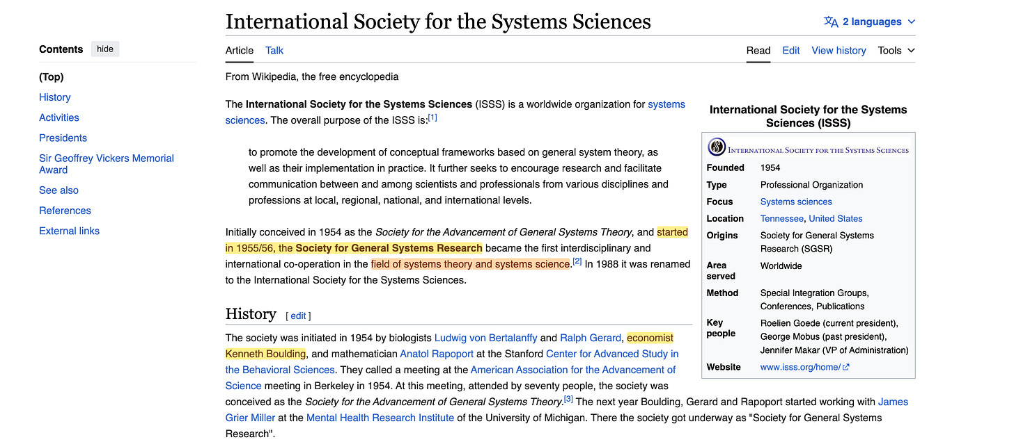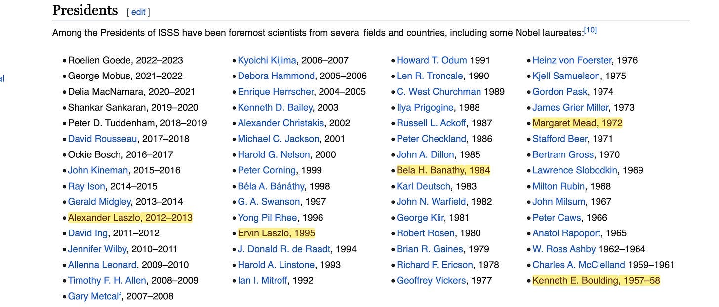 Στη συνέχεια, θα συνιδρύσει την Εταιρεία για την Έρευνα Γενικών Συστημάτων [2] και θα γίνει μάλιστα ο πρώτος πρόεδρός της [3]. Παρεμπιπτόντως, η πρωτοβουλία για την εν λόγω κοινωνία προήλθε από την AAAS, η οποία έχει ιστορικό... χρηματοδότηση από τον Rockefeller [4].