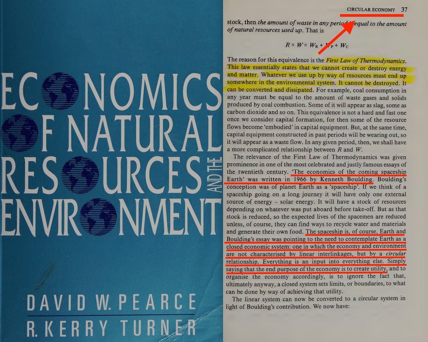 Το 1989, οι Pearce/Turner θα εξέδιδαν το βιβλίο «Οικονομικά των φυσικών πόρων και του περιβάλλοντος». Αυτό περιγράφει λεπτομερώς την έννοια της Βιώσιμης Ανάπτυξης, πώς αυτή σχετίζεται με την Κυκλική Οικονομία, και αναφέρεται ρητά στο έγγραφο Spaceship Earth του 1966 του Kenneth Boulding, το οποίο αποτελεί ένα πρώιμο έργο με μεγάλη επιρροή στο θέμα της εν λόγω κυκλικής οικονομίας. Αυτό το βιβλίο των Pearce/Turner θα αναφερόταν στη συνέχεια σε πολλά έργα µε µεγάλη επιρροή που χρηµατοδοτούνται µε επίσηµη ιδιότητα, συµπεριλαµβανοµένης της Ευρωπαϊκής Ένωσης [38] , καθώς η τελευταία το 2022 ανακοίνωσε την «Πράσινη Μετάβαση σε µια Κυκλική Οικονοµία» [39] , η οποία - όπως επανειληµµένα αναφέρθηκε παραπάνω - είναι συστηµική θεωρία.