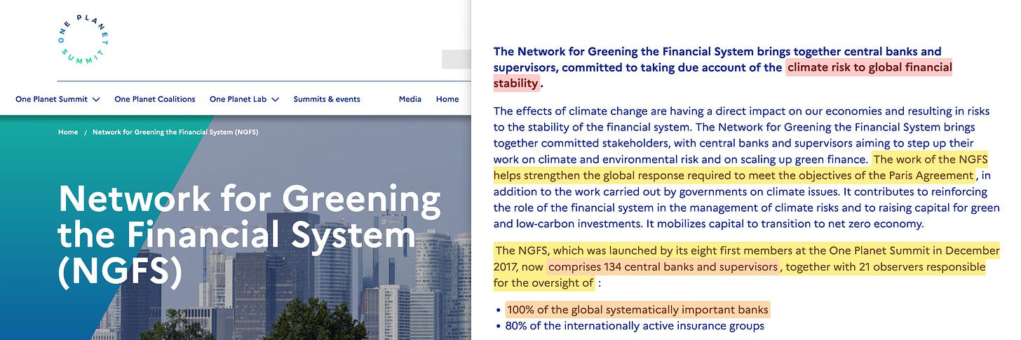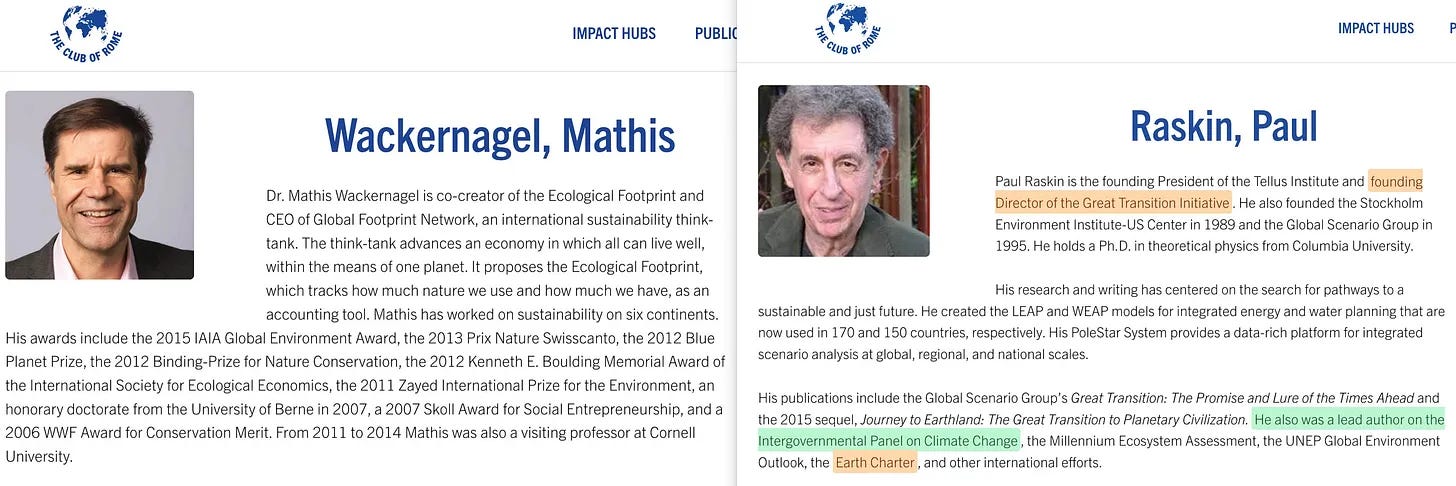 Παρεμπιπτόντως, η Πρωτοβουλία για τη Μεγάλη Μετάβαση [12] διευθύνεται από τον Paul Raskin [13], μέλος της Λέσχης της Ρώμης, το Παγκόσμιο Δίκτυο Αποτυπωμάτων (***του Άνθρακα) [14] διευθύνεται από τον Mathis Wackernagel [15], μέλος της Λέσχης της Ρώμης, και η έννοια του Αποτυπώματος Άνθρακα [16] είναι αποδεκτή [17] από την πρωτοβουλία Network for Greening the Financial System [18] , που διευθύνεται από τις κεντρικές τράπεζες [19] - και συνεπώς από την Τράπεζα Διεθνών Διακανονισμών (Bank for International Settlements) - και έχουν την υποστήριξη σχεδόν κάθε σημαντικού χρηματοπιστωτικού ιδρύματος.