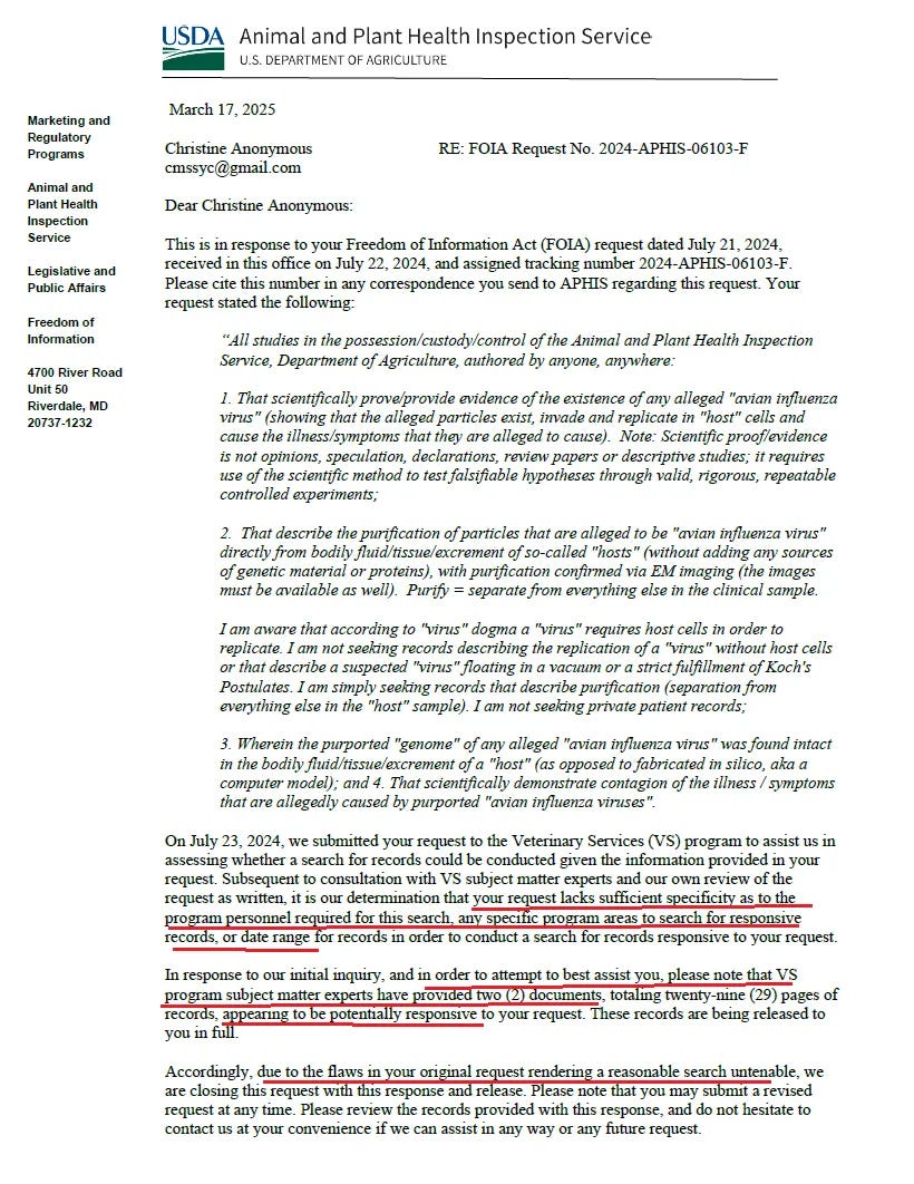 Η αίτηση FOIA που υπέβαλα στις 21 Ιουλίου 2024 στην Υπηρεσία Επιθεώρησης Υγείας Ζώων και Φυτών του Υπουργείου Γεωργίας των ΗΠΑ ολοκληρώθηκε τελικά τον Μάρτιο του τρέχοντος έτους. Το αποτέλεσμα ήταν ότι οι «ειδικοί» της υπηρεσίας δεν παρείχαν ούτε ανέφεραν κανένα σχετικό αρχείο.