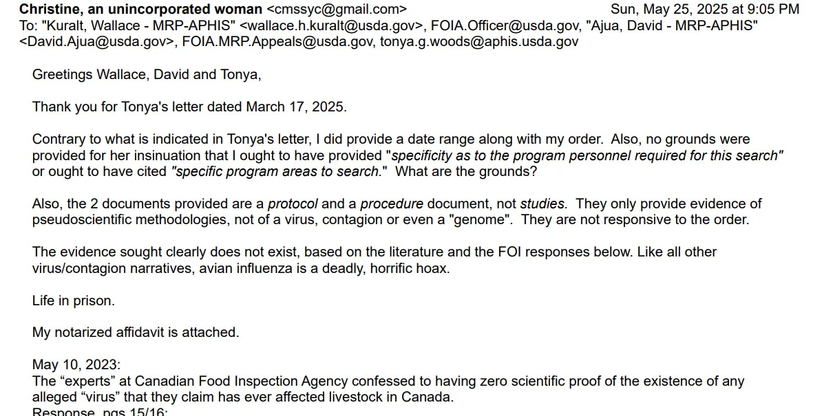 Στις 17 Μαρτίου 2025, 8 μήνες μετά την υποβολή της εντολής FOIA, έλαβα μια επιστολή με αριθμό #2024-APHIS-06103-F και «ψηφιακά υπογεγραμμένη από τον WALLACE KURALT για: Tonya G. Woods, Διευθύντρια, Νόμος περί Ελευθερίας της Πληροφορίας και Προστασίας της Ιδιωτικής Ζωής, Νομικές και Δημόσιες Υποθέσεις» (σελ. 14/15).