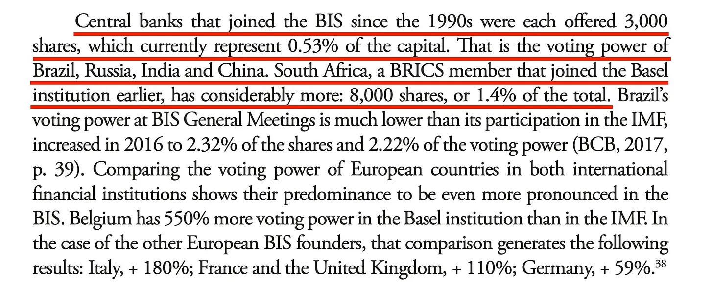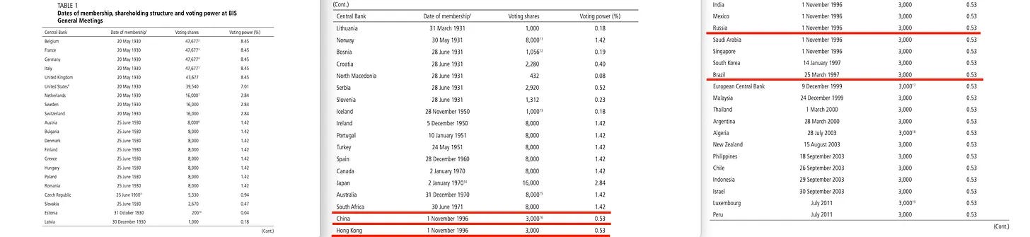 Ο συνολικός αριθμός μετοχών της BIS ανέρχεται σε 568.125. Και κατά την είσοδο στον «κλαμπ», στους νέους μέλη προσφέρεται να αγοράσουν... 3.000. Ναι, πραγματικά. Στις χώρες που προσχωρούν προσφέρεται μερίδιο 0,5% στη BIS, ανεξάρτητα από το μέγεθος της χώρας. Αυτό φαίνεται να έρχεται σε αντίθεση με την οικονομική πραγματικότητα όσον αφορά ορισμένες χώρες, ιδίως... τη Βραζιλία... τη Ρωσία... την Ινδία... την Κίνα... σίγουρα καταλαβαίνετε πού θέλω να καταλήξω.