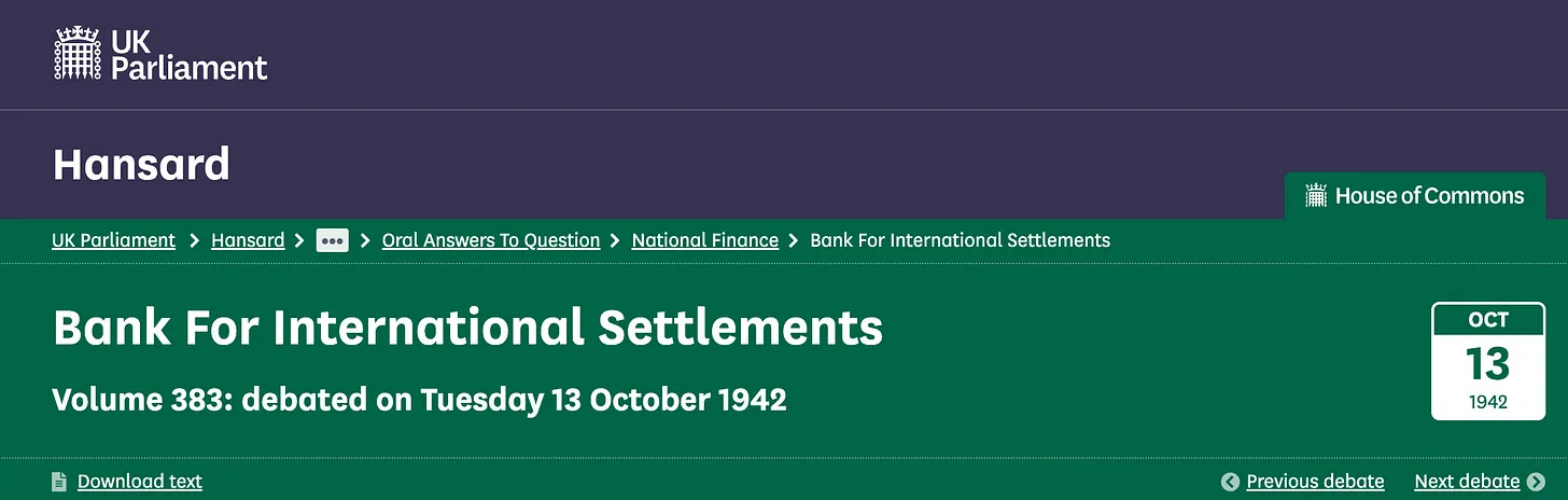 Η BIS είναι γνωστή για τη μυστικότητα της. Στην πραγματικότητα, αν προσπαθήσετε να ανακαλύψετε τη δομή της ψηφοφορίας, θα διαπιστώσετε ότι χρειάζεται πολλές ώρες για να βρείτε πληροφορίες σχετικά με την κατανομή των μετοχών σε μια σειρά ξεχωριστών εκθέσεων, όπου συχνά οι εν λόγω κατανομές εκφράζονται σε τοπικά νομίσματα ή μπορεί ακόμη και να συγχωνεύονται με άλλα περιουσιακά στοιχεία. Και η BIS δεν έχει παράσχει κατάλογο από το 1939, και αυτό δεν είναι λάθος. Στην πραγματικότητα, εδώ είναι ένας πρώιμος κατάλογος που σχετίζεται με το δικαίωμα ψήφου. Είναι από το 1942, όταν η Τράπεζα Διεθνών Διακανονισμών συζητήθηκε κατά τη διάρκεια του Β’ Παγκοσμίου Πολέμου στο βρετανικό κοινοβούλιο.