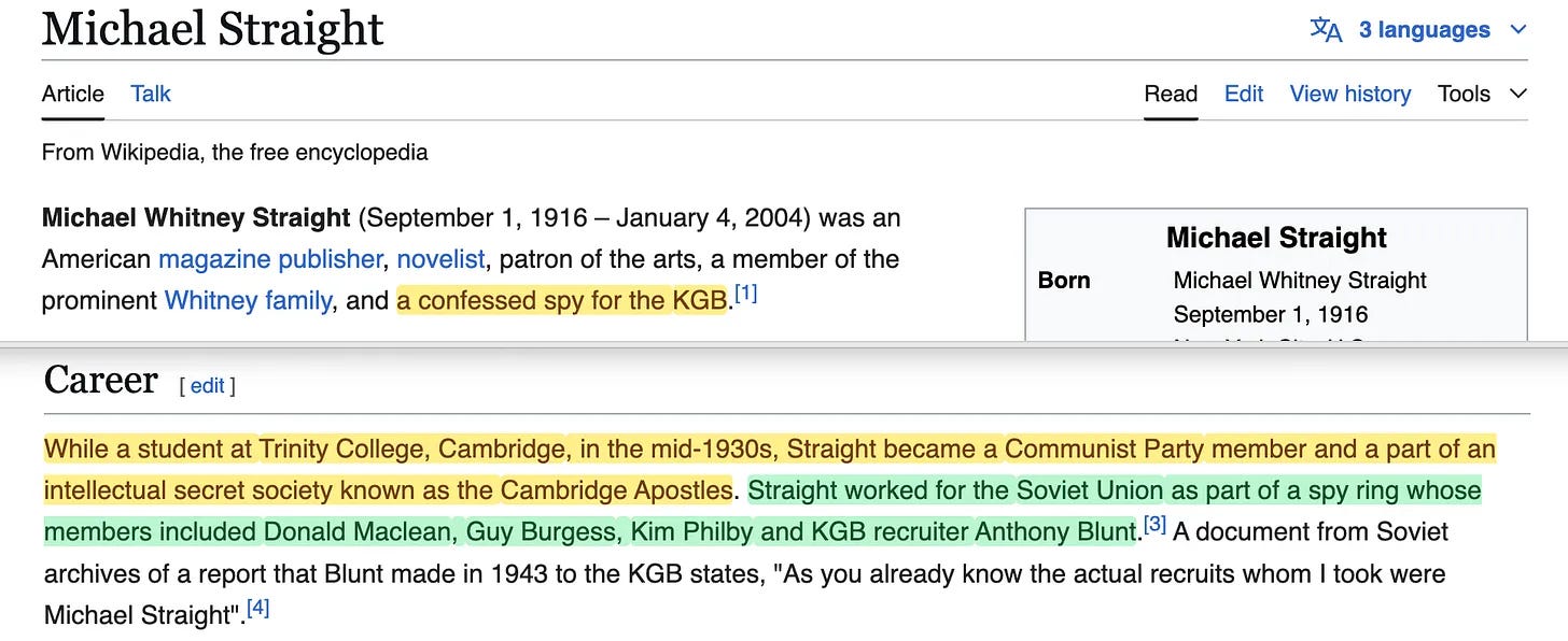 Επειδή ο Michael Straight δεν ήταν ένας οποιοσδήποτε Απόστολος. Ήταν ένας πραγματικός σοβιετικός κατάσκοπος [6].