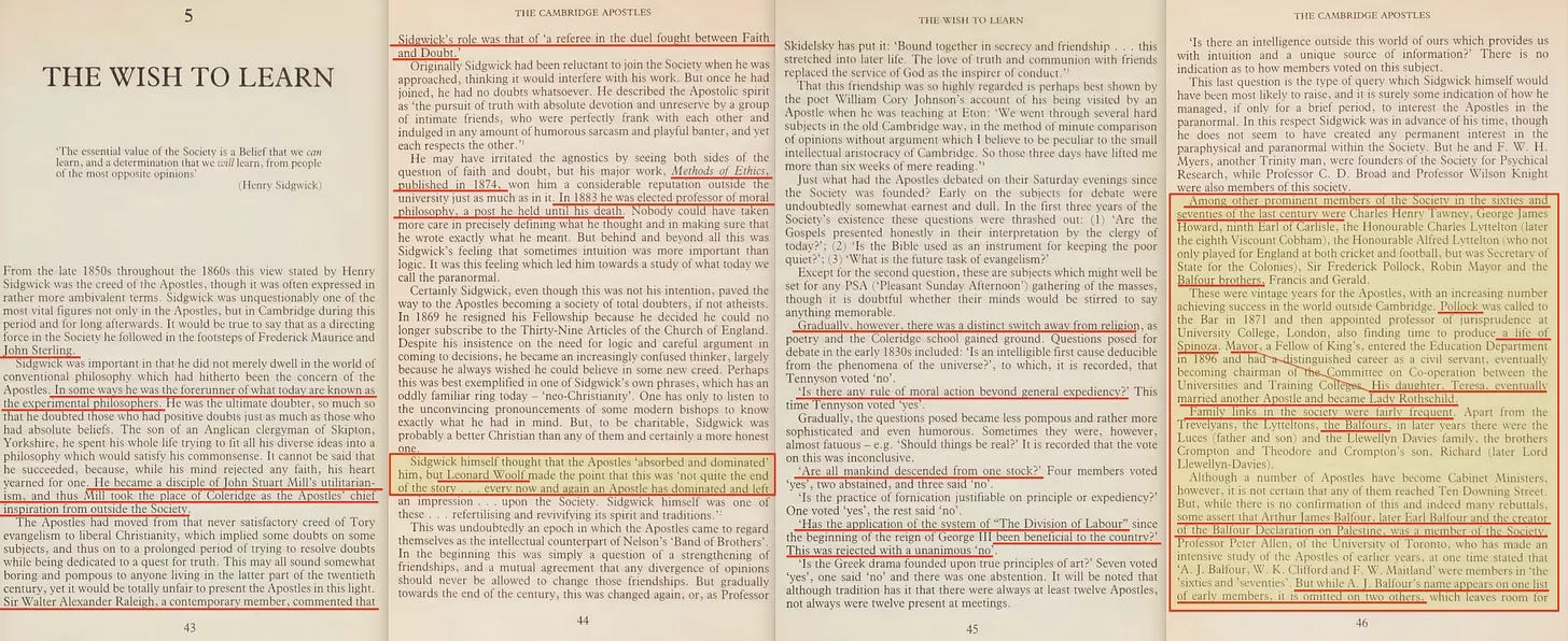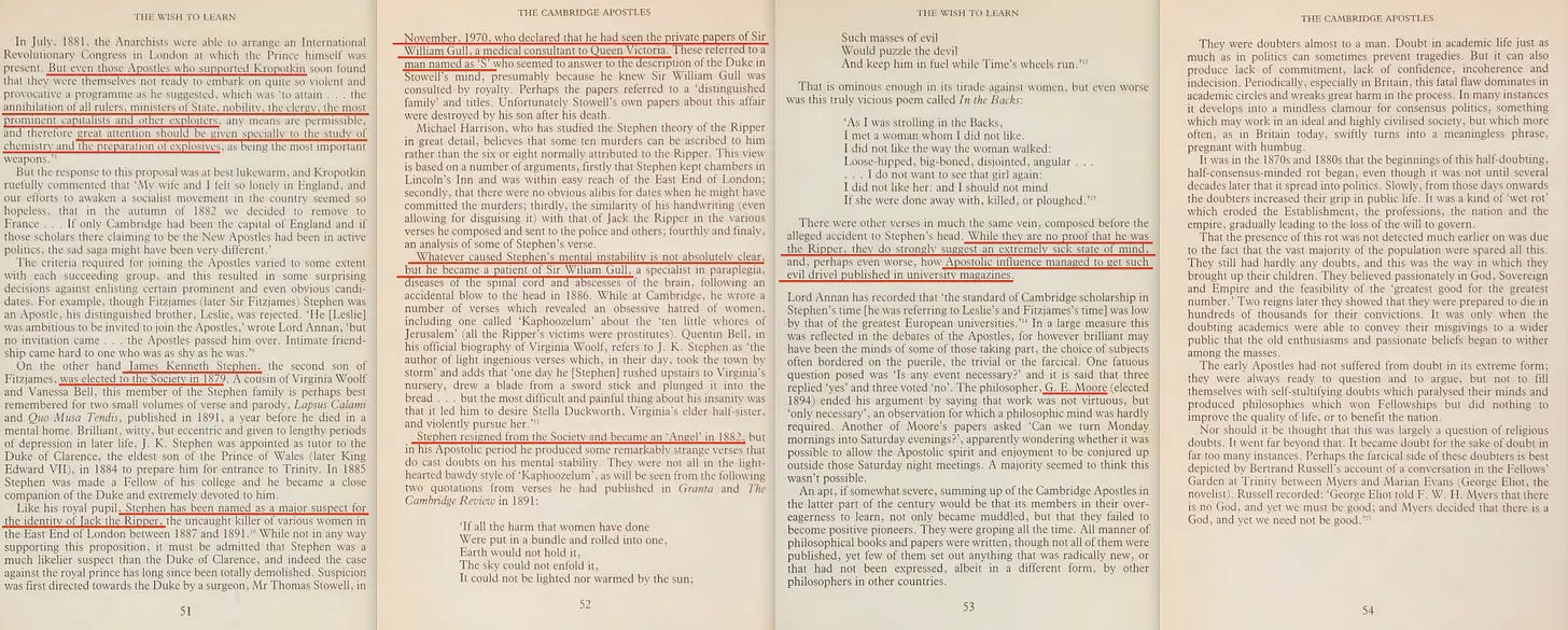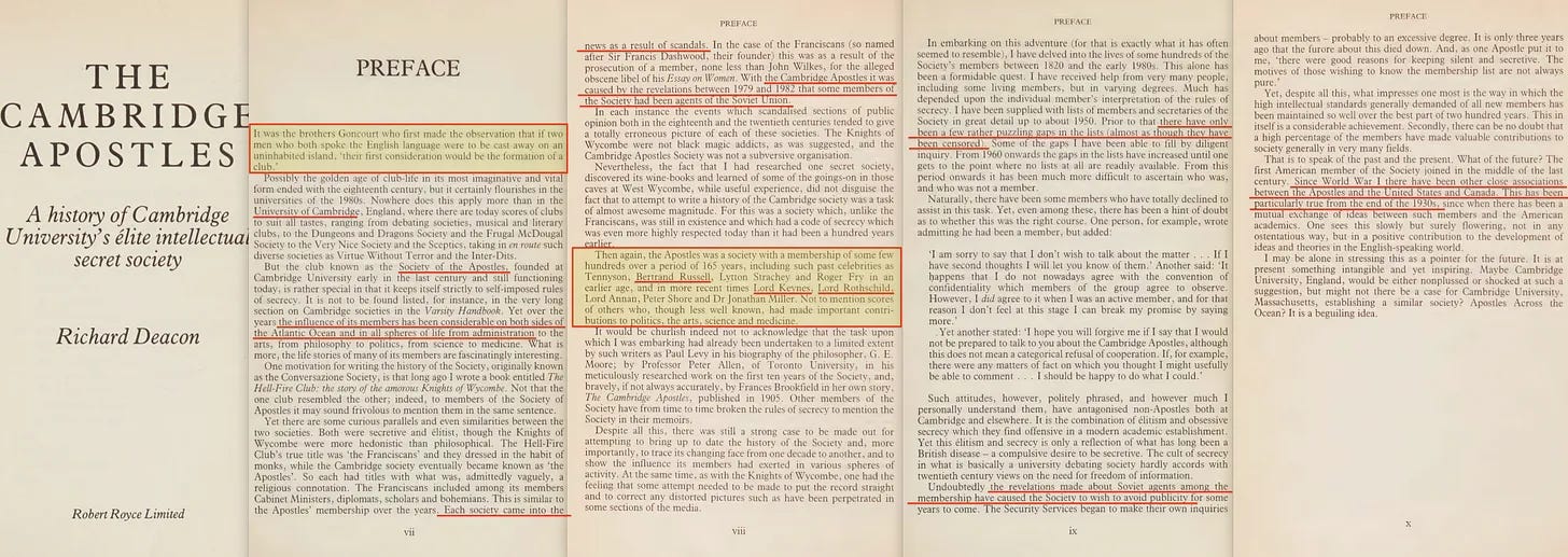 Και εδώ είναι που ανατρέχουμε στο βιβλίο του Richard Deacon του 1985, The Cambridge Apostles [1], για να ρίξουμε φως σε αυτή την άκρως μυστικοπαθή κοινωνία.