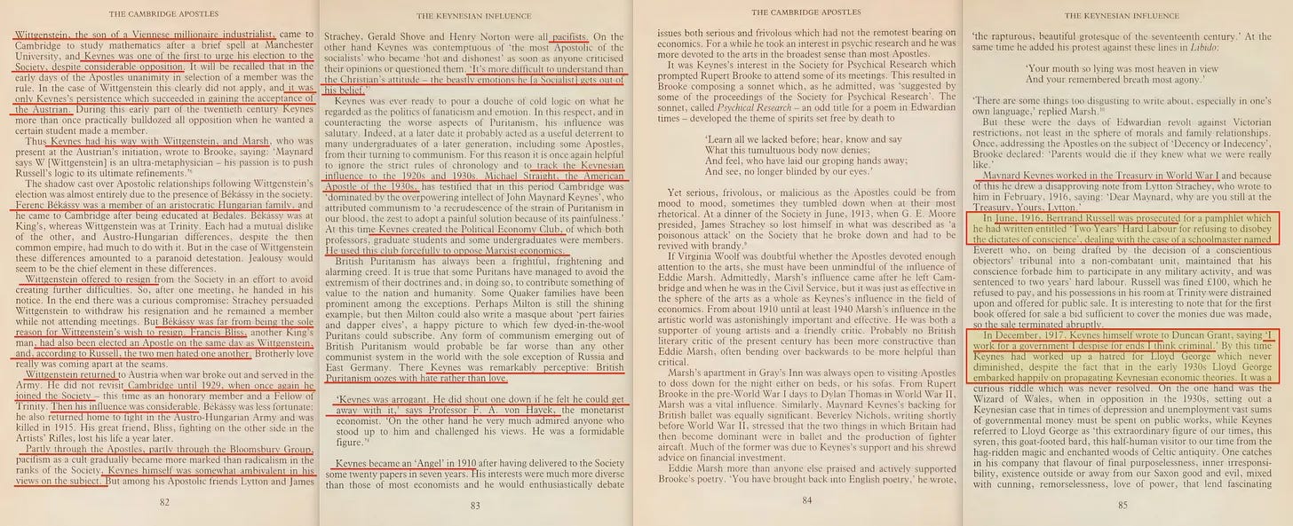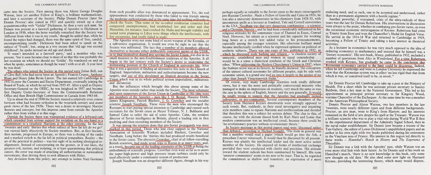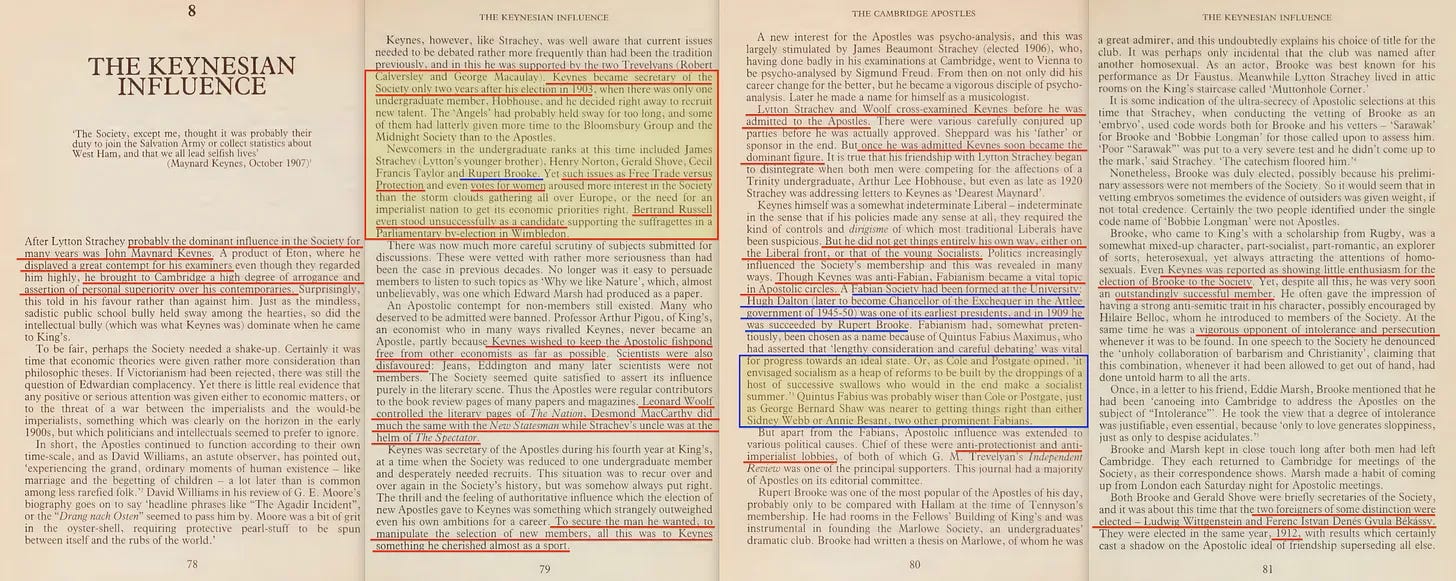 Έτσι, σε αυτό το στάδιο, θα πρέπει να είναι αρκετά σαφές - οι Απόστολοι του Cambridge συγκέντρωσαν σταδιακά την εξουσία τους, και ο Leonard S. Woolf, ο Λόρδος (Victor) Rothschild και ο Keynes ήταν βασικά μέλη όταν αυτό έλαβε χώρα. Η κοινωνία σταδιακά κατέληξε να είναι γεμάτη από μελλοντικούς κατασκόπους και αυτό που φαίνεται να ήταν μια βαρυτική επιρροή που ασκούσε ο επιστημονικός σοσιαλισμός.