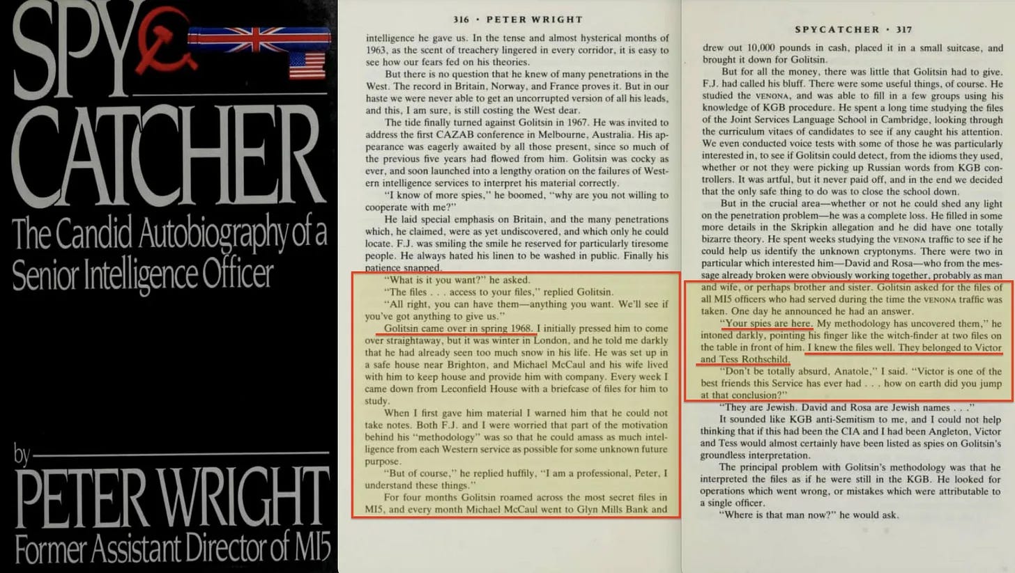 Σύμφωνα με το βιβλίο του Peter Wright «Spy Catcher» [9] , το 1968 ο Σοβιετικός αποστάτης Anatoliy Golitsyn είχε πρόσβαση στα πιο ευαίσθητα αρχεία προσωπικού της MI5 σε μια προσπάθεια να εντοπίσει κατασκόπους που θα μπορούσαν να αποκαλυφθούν από τις αποκρυπτογραφήσεις του VENONA. Μετά από μήνες σχολαστικής εξέτασης, ο Golitsyn έκανε μια σκληρή δήλωση: «Οι κατάσκοποί σας είναι εδώ», είπε, δείχνοντας δύο συγκεκριμένους φακέλους. ‘Ανήκαν στον Victor και την Tess Rothschild’. Ενώ ο Wright και άλλοι στην Υπηρεσία είχαν αντιρρήσεις - σημειώνοντας ότι ο Victor θεωρούνταν ένας από τους πιο έμπιστους συμμάχους της MI5 - ο Golitsyn παρέμεινε σταθερός. Η μεθοδολογία του, ισχυρίστηκε, είχε αποκαλύψει βαθιά και προηγουμένως μη ανιχνευμένη διείσδυση.