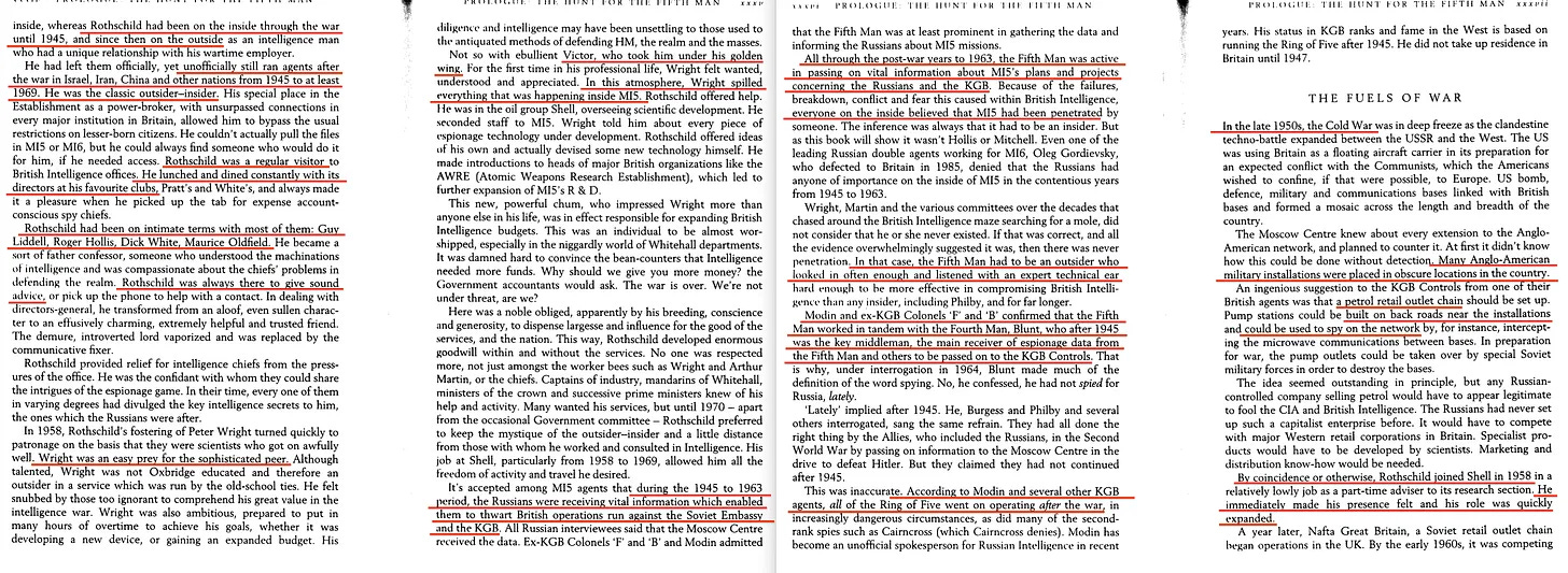 Αυτό που το κάνει ακόμη πιο εντυπωσιακό είναι η εγγύτητα του Rothschild με τους ίδιους τους βασικούς σοβιετικούς πράκτορες. Το τριώροφο διαμέρισμά του στο Λονδίνο λειτουργούσε και ως σαλόνι για τους συναδέλφους του Αποστόλους που είχαν μετατραπεί σε πράκτορες: Anthony Blunt, Guy Burgess, Kim Philby, και τους αγγελιοφόρους τους. Η Tess Mayor, μετέπειτα Lady Rothschild, ήταν επίσης μπλεγμένη σε αυτούς τους κύκλους, και ο ξάδελφος-σε-δικαίου της Malcolm Muggeridge έφτασε να αμφισβητήσει ανοιχτά τις συμμαχίες του Rothschild μετά από ένα ανατριχιαστικό δείπνο το 1944, όπου ο Rothschild απέρριψε ανοιχτά την ανωτερότητα των συμμαχικών μυστικών υπηρεσιών. Η εμβέλεια του Rothschild δεν περιοριζόταν στη Βρετανία - έκανε ταξίδια πληροφοριών στη Μόσχα, καλλιέργησε διασυνδέσεις στο πυρηνικό κατεστημένο των ΗΠΑ και συνέβαλε καθοριστικά στη μεταφορά των υποκλοπών του Bletchley Park που προέρχονταν από το Enigma απευθείας στον Στάλιν. Ακόμα και μετά τον πόλεμο, διατήρησε αυτά τα δίκτυα με εμπορικά και επιστημονικά προσχήματα, φέρεται να ενσωματώθηκε στη Nafta, τη Shell και την Επιτροπή Ατομικής Ενέργειας, ενώ συνέχισε τις μυστικές σχέσεις με συνδέσμους της KGB σε όλη την Ευρώπη.