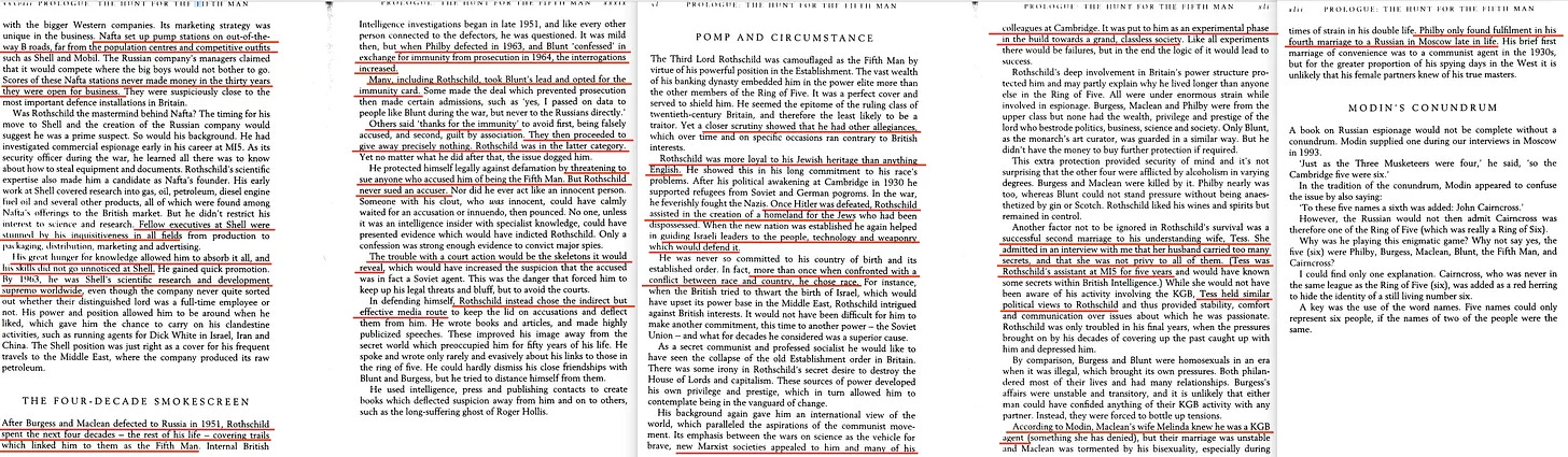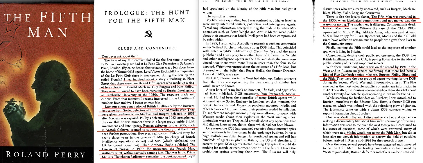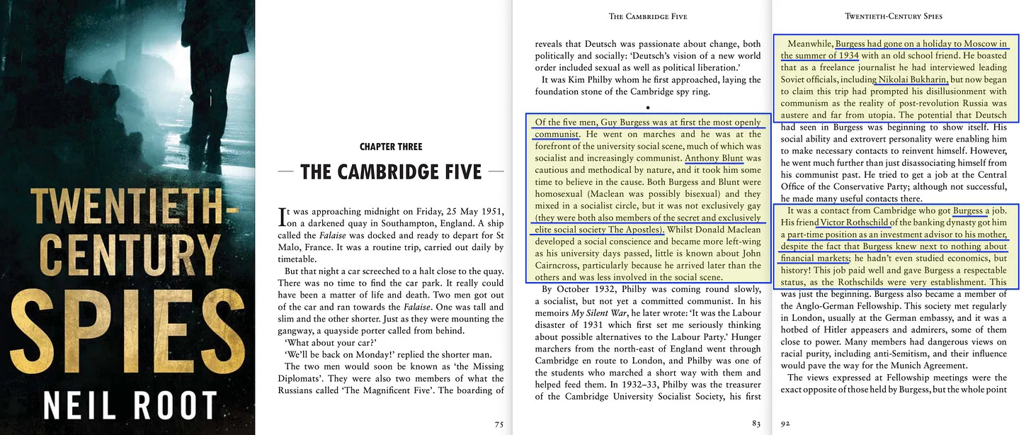 Το βιβλίο του Neil Root, Twentieth-Century Spies [8] περιλαμβάνει παρεμπιπτόντως ένα κεφάλαιο για τους πέντε του Cambridge. Και αν εξαιρέσουμε τις σύγχρονες σκέψεις για τους «εναλλακτικούς τρόπους ζωής», τη δεκαετία του 1930 δεν ήταν καθόλου αποδεκτό. Ωστόσο, τόσο ο Burgess όσο και ο Blunt ήταν ανοιχτά ομοφυλόφιλοι, ενώ ο Maclean πιθανώς αμφιφυλόφιλος - όλοι τους βαθιά ενσωματωμένοι στους σοσιαλιστικούς κύκλους, και το κρίσιμο είναι ότι όλοι τους ήταν μέλη των Αποστόλων του Cambridg.