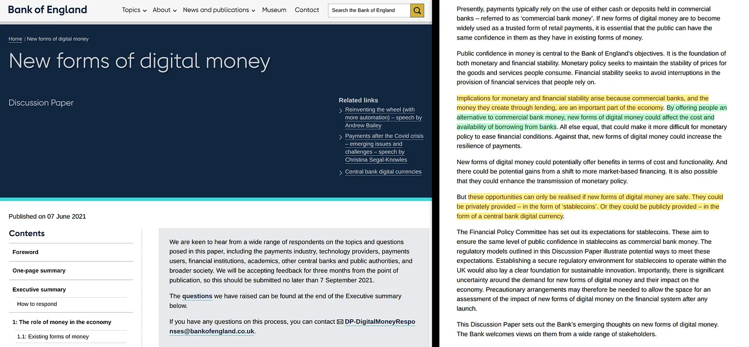 Οι επιπτώσεις για τη νομισματική και χρηματοπιστωτική σταθερότητα προκύπτουν επειδή οι εμπορικές τράπεζες και το χρήμα που δημιουργούν μέσω του δανεισμού αποτελούν σημαντικό μέρος της οικονομίας. Προσφέροντας στους πολίτες μια εναλλακτική λύση στο χρήμα των εμπορικών τραπεζών, οι νέες μορφές ψηφιακού χρήματος θα μπορούσαν να επηρεάσουν το κόστος και τη διαθεσιμότητα του δανεισμού από τις τράπεζες. Σε κάθε άλλη περίπτωση, αυτό θα μπορούσε να καταστήσει δυσκολότερη τη νομισματική πολιτική να χαλαρώσει τις χρηματοπιστωτικές συνθήκες. Στον αντίποδα, οι νέες μορφές ψηφιακού χρήματος θα μπορούσαν να αυξήσουν την ανθεκτικότητα των πληρωμών.
