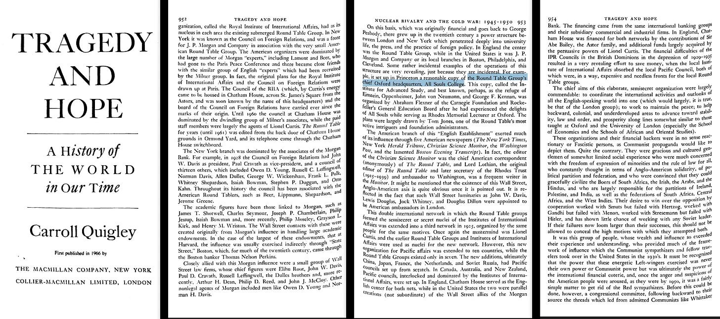 Το All Souls στην Οξφόρδη, παρεμπιπτόντως, ήταν το κύριο πεδίο στρατολόγησης των Round Tables, δηλαδή της Rhodes [3].