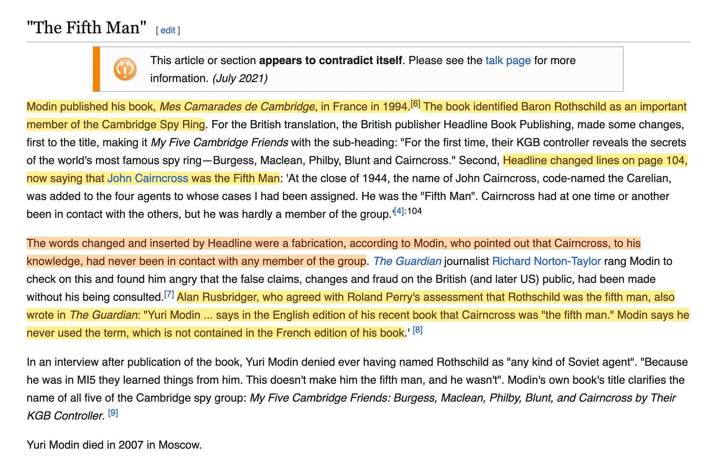 Και όταν ο Yuri Modin δημοσίευσε το 1994 τη γαλλόφωνη περιγραφή του για τους Πέντε του Cambridge, Mes Camarades de Cambridge, φέρεται να ανακάλυψε έκπληκτος ότι βασική λεπτομέρεια είχε αλλάξει στην αγγλική μετάφραση [12].