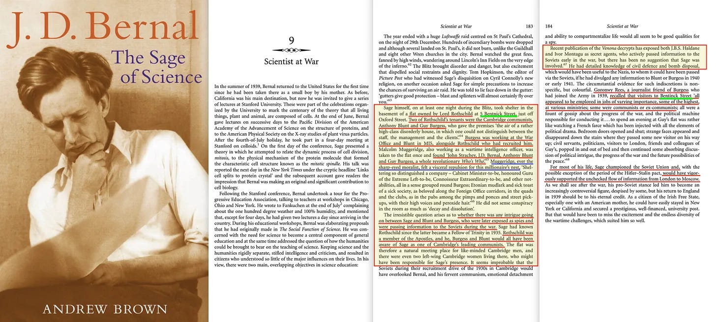 «Ο ίδιος ο Sage, τουλάχιστον μια νύχτα κατά τη διάρκεια του Blitz, βρήκε καταφύγιο στο υπόγειο ενός διαμερίσματος που ανήκε στον Λόρδο Rothschild στην οδό Bentnick 5, ακριβώς έξω από την Oxford Street. Δύο από τους ενοικιαστές του Rothschild ήταν οι κομμουνιστές του Cambridge, Anthony Blunt και Guy Burgess, οι οποίοι έδωσαν στους χώρους “τον αέρα ενός μάλλον υψηλού επιπέδου ακατάστατου σπιτιού, στο οποίο δεν μπορούσε κανείς να διακρίνει μεταξύ του προσωπικού, της διεύθυνσης και των πελατών. Ο Burgess εργαζόταν στο γραφείο πολέμου και ο Blunt στην MI5, μαζί με τον Rothschild που τον είχε στρατολογήσει».