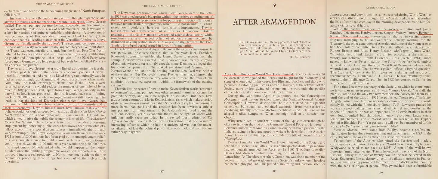 «... εντοπίζουν την κεϋνσιανή επιρροή στη δεκαετία του 1920 και του 1930. Ο Michael Straight, ο Αμερικανός Απόστολος της δεκαετίας του 1930, έχει καταθέσει ότι εκείνη την περίοδο το Cambridge «κυριαρχούνταν από την ακατανίκητη διάνοια του John Maynard Keynes», ο οποίος απέδιδε τον κομμουνισμό σε «μια αναζωπύρωση του στελέχους του πουριτανισμού στο αίμα μας, την όρεξη να υιοθετήσουμε μια επώδυνη λύση λόγω της επώδυνης φύσης της». Εκείνη την εποχή ο Keynes δημιούργησε τη Λέσχη Πολιτικής Οικονομίας, στην οποία ήταν μέλη τόσο καθηγητές, μεταπτυχιακοί φοιτητές όσο και ορισμένοι προπτυχιακοί φοιτητές. Χρησιμοποίησε τη λέσχη αυτή δυναμικά για να αντιταχθεί στη μαρξιστική οικονομική επιστήμη».
