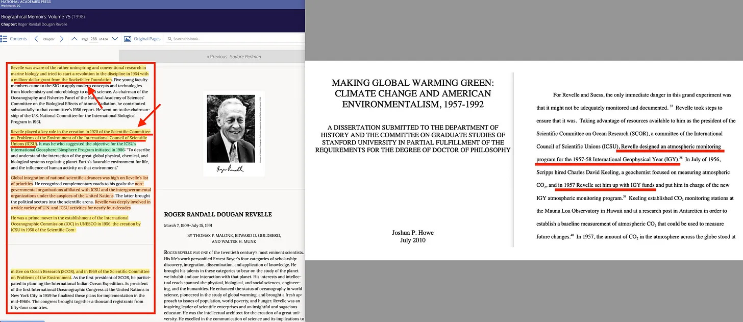 Οι μετρήσεις του Keeling σηματοδότησαν την πρακτική έναρξη της επιχείρησης για το κλίμα. Αυτό όμως που ήταν λιγότερο γνωστό είναι ότι δρομολογήθηκε μέσω του Roger Revelle [18] , ο οποίος ήταν μέχρι το λαιμό χρηματοδοτημένος από το Ίδρυμα Rockefeller.