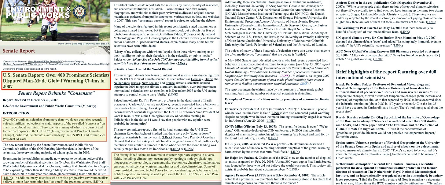 2007 Έκθεση της Γερουσίας των ΗΠΑ: Πάνω από 400 διακεκριμένοι επιστήμονες αμφισβήτησαν τους ισχυρισμούς περί ανθρωπογενούς υπερθέρμανσης του πλανήτη το 2007 [97].