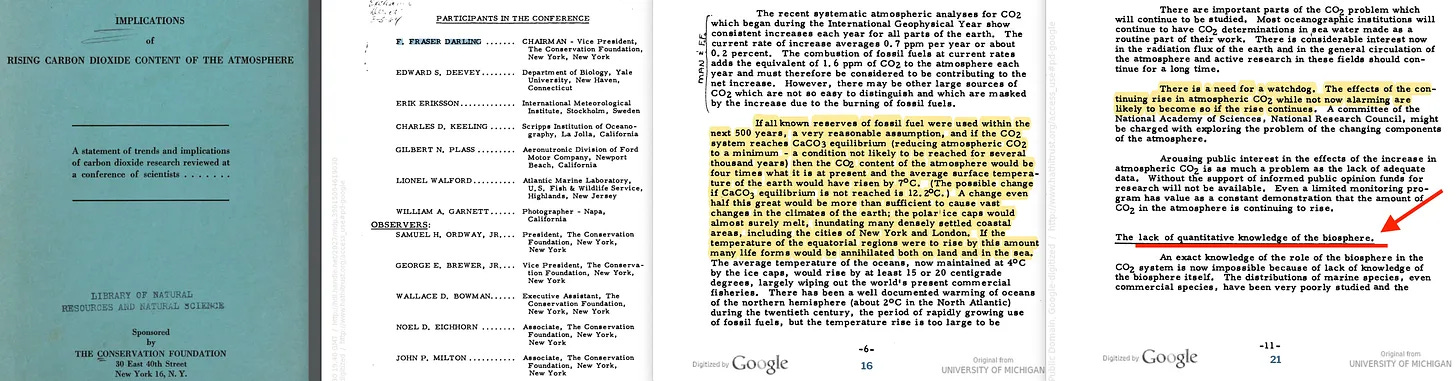Η πρώτη αμφίβολη «συναίνεση για τον άνθρακα» επιτεύχθηκε σε εκδήλωση που διοργάνωσε το Ίδρυμα Διατήρησης που χρηματοδοτείται από τον Rockefeller, υπό την προεδρία του Fraser Darling. Μόνο δύο πραγματικοί επιστήμονες του κλίματος συνέβαλαν (Keeling και Plass, και οι δύο καλύπτονται παραπάνω), και το έγγραφο που προέκυψε δεν περιείχε καμία απολύτως αναφορά που να υποστηρίζει τους παράλογους, κινδυνολογικούς ισχυρισμούς τους - το οποίο ωστόσο συνέχισε να χρησιμεύει ως έγγραφο εισόδου για την «Αποκατάσταση της ποιότητας του περιβάλλοντος» από το 1965 (παρακάτω).
