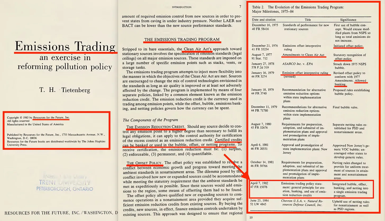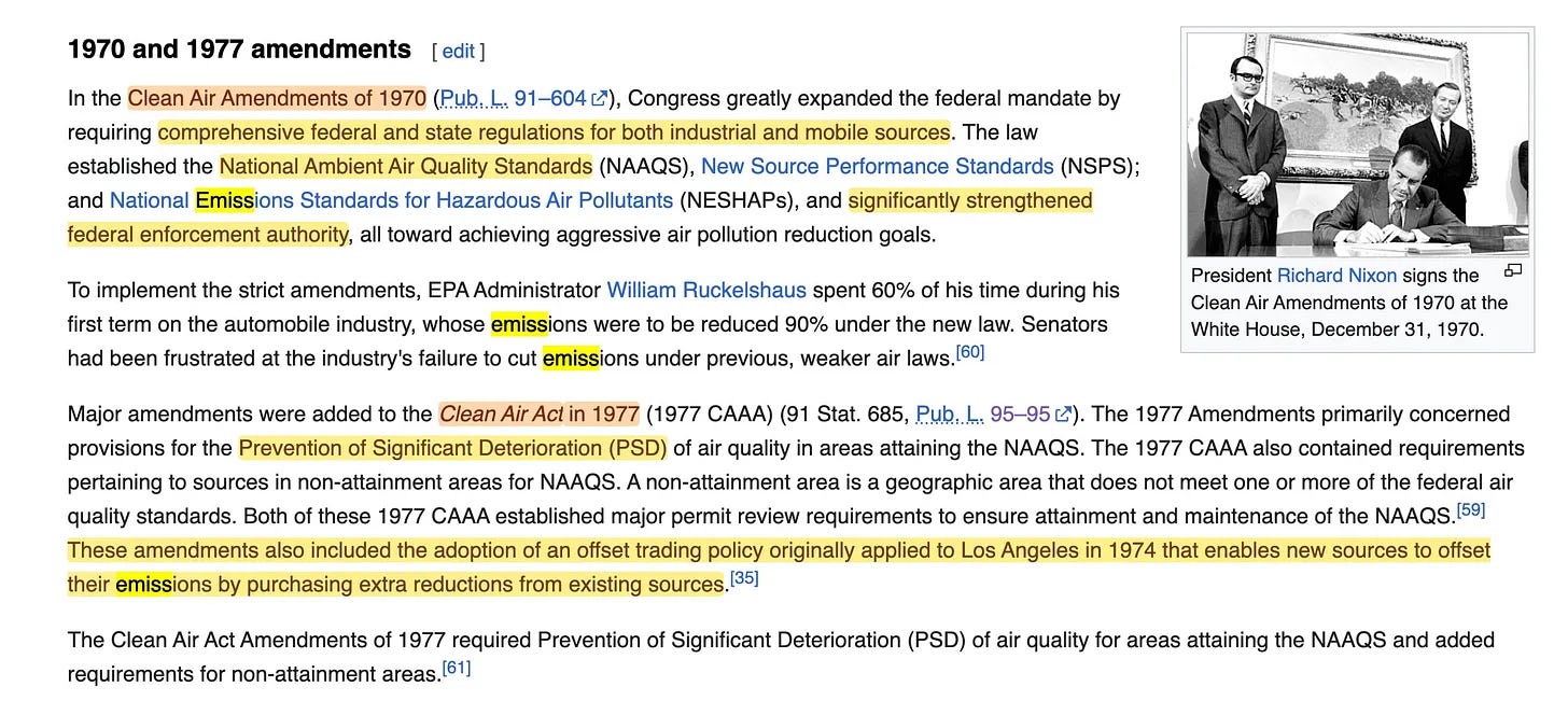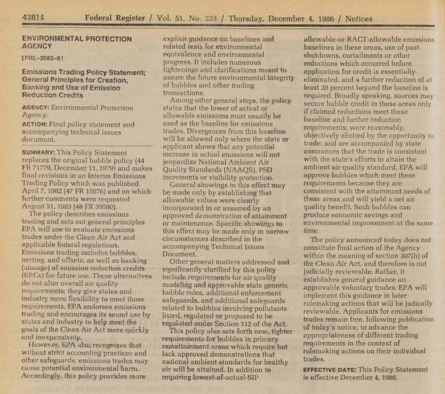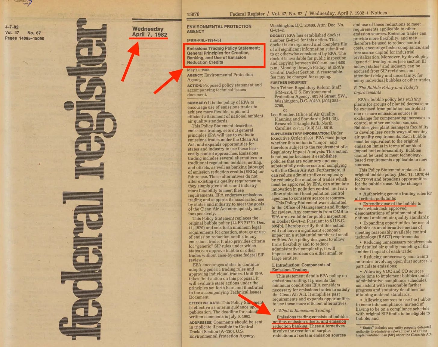 Αφού ολοκληρώθηκαν οι εργασίες για τον βασικό μηχανισμό και με μια πρώτη έκθεση που περιγράφει λεπτομερώς την τιμολόγηση των εκπομπών διοξειδίου του άνθρακα, η τροπολογία του νόμου για τον καθαρό αέρα του 1977 περιελάμβανε την «Πρόληψη σημαντικής επιδείνωσης», η οποία περιλαμβάνει διατυπώσεις σχετικά με την αντιστάθμιση, την αποθήκευση και την εμπορία εκπομπών.