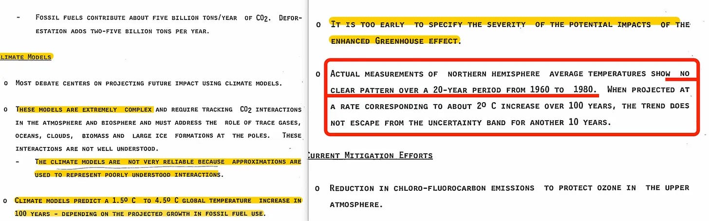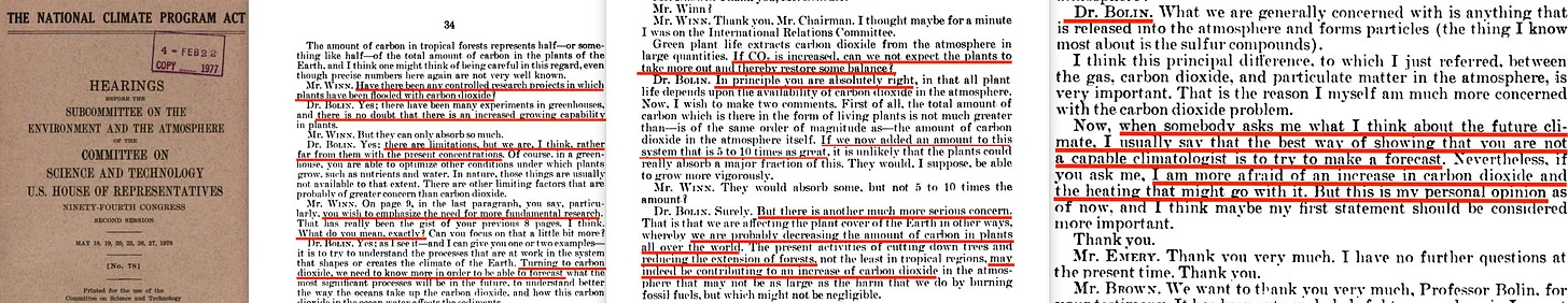Ο ίδιος ο άνθρωπος που ηγήθηκε της αφήγησης για το κλίμα στις δεκαετίες του 1970 και 1980 - ο Bert Bolin - εμφανίστηκε μπροστά στη Βουλή των Αντιπροσώπων των ΗΠΑ- μια αξιοσημείωτη εκδήλωση στην οποία παραδέχτηκε ότι - εκτός από εικασίες - όχι μόνο γνώριζαν στην πραγματικότητα πολύ λίγα, αλλά αυτό που γνώριζαν ήταν ότι το διοξείδιο του άνθρακα οδηγούσε σε ταχύτερη ανάπτυξη των φυτών.