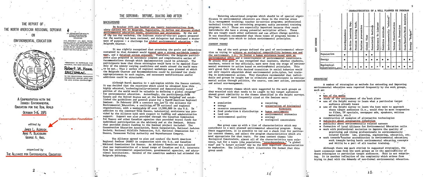 Παρά την ύπαρξη ελάχιστης νόμιμης επιστήμης σχετικά με την επίδραση του διοξειδίου του άνθρακα στην ατμόσφαιρα και με τους επιστήμονες γενικά να διαφωνούν πλήρως, οι διάφοροι διεθνείς οργανισμοί άρχισαν να σχεδιάζουν την εκπαιδευτική πτυχή. Στις διαβουλεύσεις περιλαμβανόταν η πλύση εγκεφάλου μέσω των κυρίαρχων μέσων ενημέρωσης, η οποία θα έπρεπε επίσης να περιλαμβάνει «πληροφορίες για εναλλακτικούς τρόπους ζωής», ανεξάρτητα από το πόσο παράλογο θα φαινόταν αυτό στο πλαίσιο της περιβαλλοντικής εκπαίδευσης.