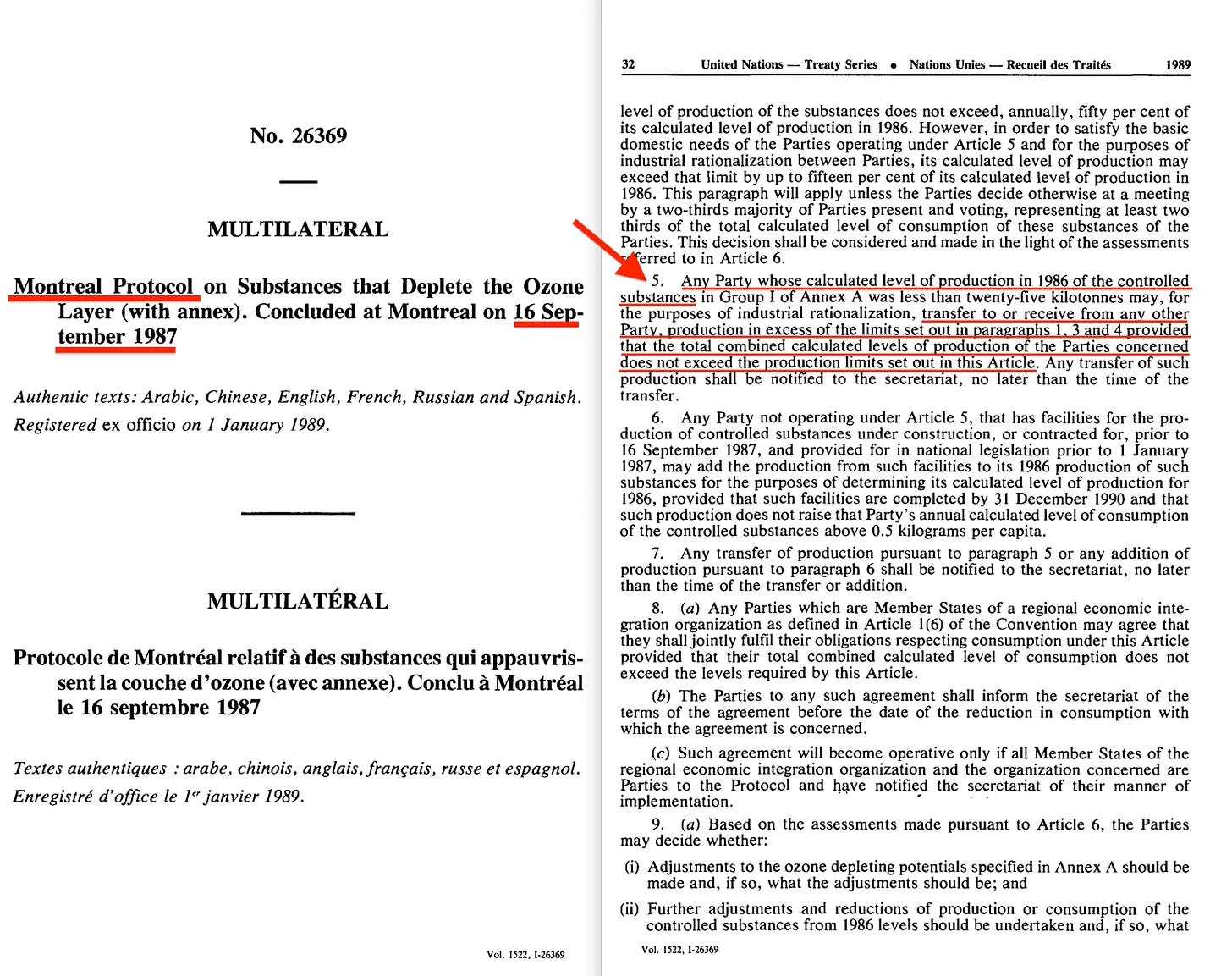 Η ανακάλυψη της τρύπας του όζοντος οδήγησε σε αυτό το πρωτόκολλο, συμπεριλαμβανομένης της γλώσσας που σχετίζεται με τη μεταφορά αδειών εκπομπών μεταξύ των μερών.