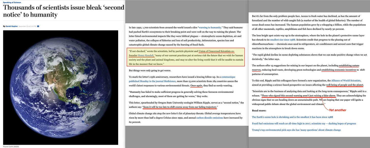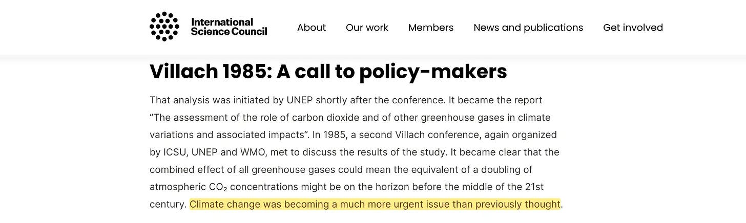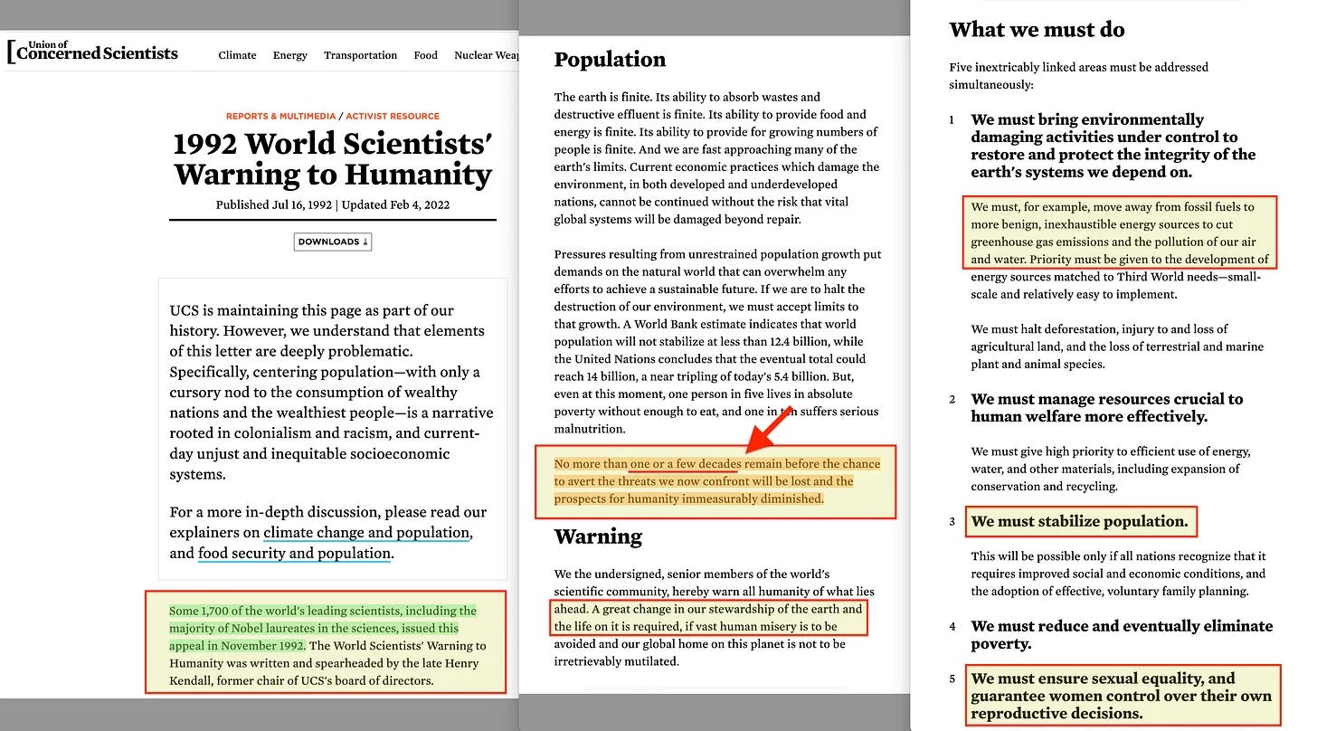 Αφού είπε ψέματα για τα πυρηνικά τη δεκαετία του ‘70, άφησε την Ένωση Ανήσυχων Επιστημόνων να εντείνει το φόβο μετά τη Σύνοδο Κορυφής για τη Γη στο Rio. Και παρόλο που έχω ακούσει επανειλημμένους ισχυρισμούς ότι αυτό δεν είναι «τίποτα σπουδαίο», το απλό γεγονός - και παραθέτω - «Περίπου 1.700 από τους κορυφαίους επιστήμονες του κόσμου, συμπεριλαμβανομένης της πλειοψηφίας των βραβευμένων με Νόμπελ στις επιστήμες, απηύθυναν αυτή την έκκληση τον Νοέμβριο του 1992» συν το ότι έχω ζήσει προσωπικά το γεγονός, αυτό είναι προφανώς ένας απόλυτος παραλογισμός. Το έγγραφο αναφέρει επίσης απερίφραστα: «Δεν απομένει παρά μία ή μερικές δεκαετίες πριν χαθεί η ευκαιρία να αποτρέψουμε τις απειλές που αντιμετωπίζουμε σήμερα και οι προοπτικές για την ανθρωπότητα μειωθούν αφάνταστα». Έχουν περάσει πλέον πάνω από 3 δεκαετίες, πράγμα που σημαίνει ότι είτε η πρόβλεψη ήταν θεαματικά λανθασμένη, είτε είστε από αυτούς που θα επιμείνουν να αποδυναμώνουν το μήνυμα σε τέτοιο βαθμό ώστε η γνώμη σας ειλικρινά να καθίσταται άνευ αξίας, όπως αναμφίβολα θα κάνετε ή θα δικαιολογήσετε τα ίδια ακριβώς 32 χρόνια από τώρα και στο εξής, καθιστώντας σας έτσι εντελώς αναξιόπιστους.
