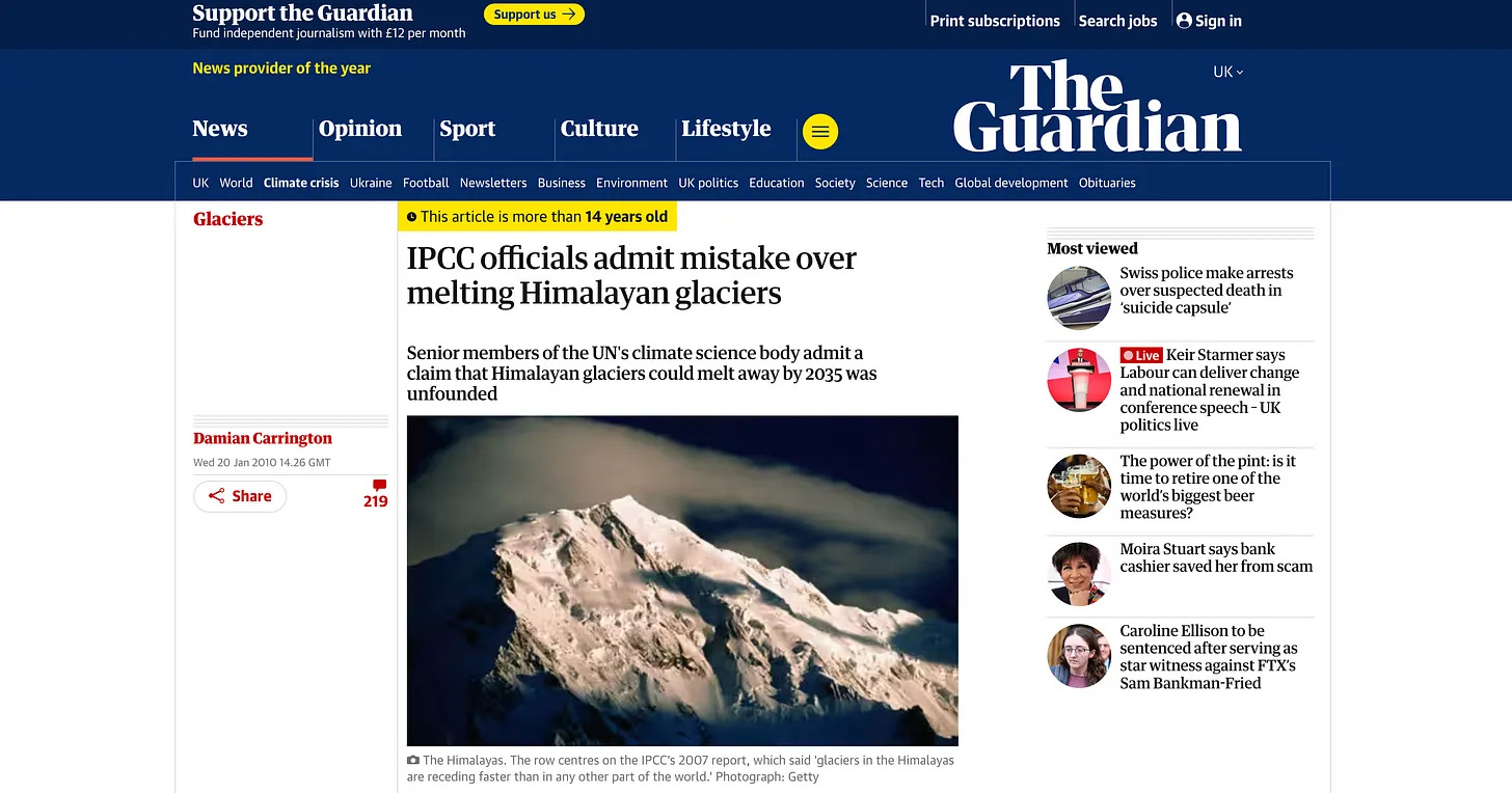 2007 Οι αξιωματούχοι της IPCC παραδέχονται λάθος σχετικά με το λιώσιμο των παγετώνων των Ιμαλαΐων [98].